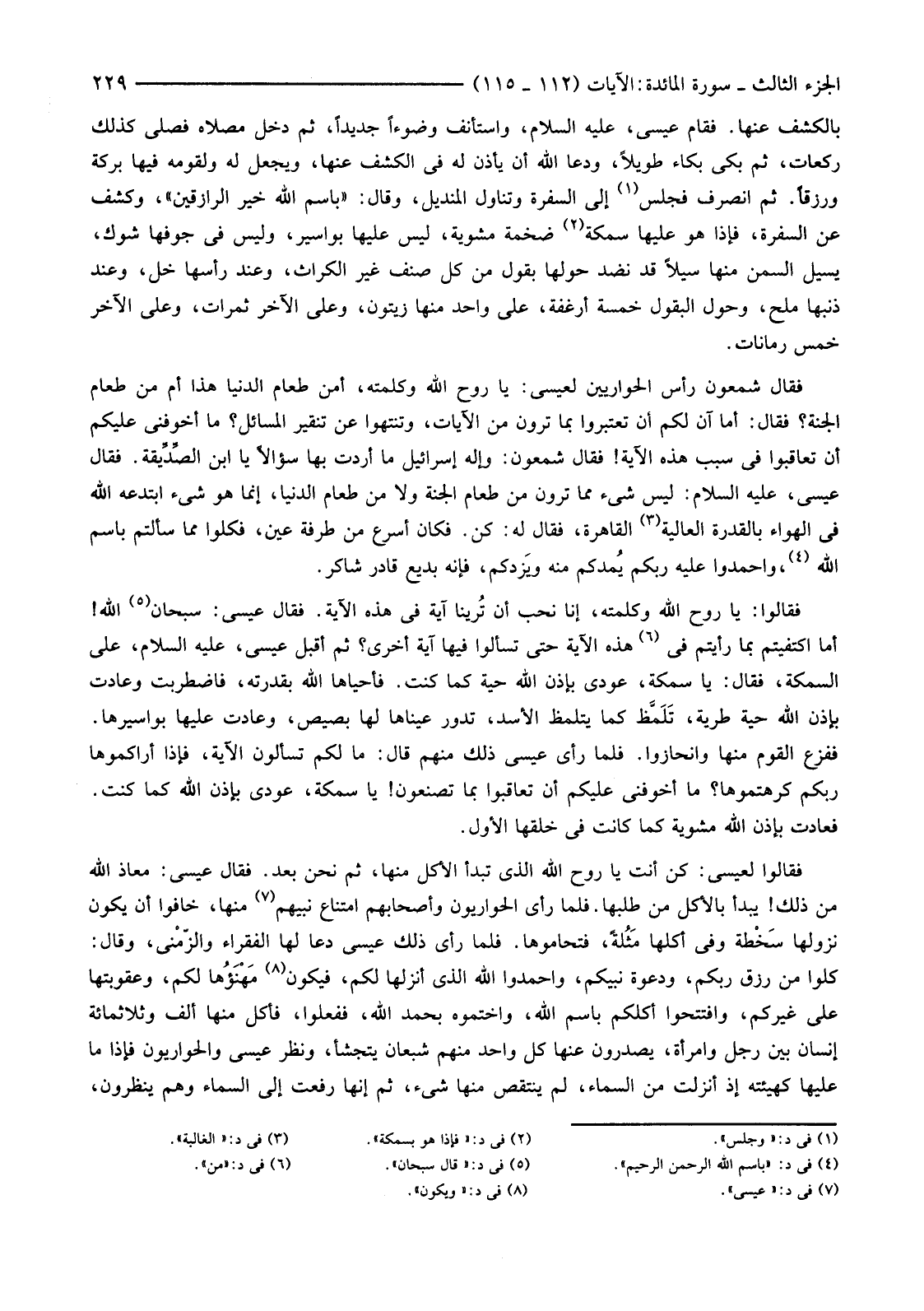 فَقَالَ شَمْعُونُ رَأْسُ الْحَوَارِيِّينَ لِعِيسَى: يَا رُوحَ اللَّهِ وَكَلِمَتَهُ، أَمِنْ طَعَامِ الدُّنْيَا هَذَا أَمْ مِنْ طَعَامِ الْجَنَّةِ؟ فَقَالَ: أَمَا آنَ لَكُمْ أَنْ تَعْتَبِرُوا بِمَا تَرَوْنَ مِنَ الْآيَاتِ، وَتَنْتَهُوا عَنْ تَنْقِيرِ الْمَسَائِلِ؟ مَا أَخْوَفُنِي عَلَيْكُمْ أَنْ تُعَاقَبُوا فِي سَبَبِ نُزُولِ هَذِهِ الْآيَةِ! فَقَالَ شَمْعُونُ: وَإِلَهِ إِسْرَائِيلَ مَا أَرَدْتُ بِهَا سُؤَالًا يَا ابْنَ الصِّدِّيقة. فَقَالَ عِيسَى، عَلَيْهِ السَّلَامُ: لَيْسَ شَيْءٌ مِمَّا تَرَوْنَ مِنْ طَعَامِ الْجَنَّةِ وَلَا مِنْ طَعَامِ الدُّنْيَا، إِنَّمَا هُوَ شَيْءٌ ابْتَدَعَهُ اللَّهُ فِي الْهَوَاءِ بِالْقُدْرَةِ الْعَالِيَةِ (3) الْقَاهِرَةِ، فَقَالَ لَهُ: كُنْ. فَكَانَ أَسْرَعَ مِنْ طَرْفَةِ عَيْنٍ، فَكُلُوا مِمَّا سَأَلْتُمْ بِاسْمِ اللَّهِ (4) وَاحْمَدُوا عَلَيْهِ رَبَّكُمْ يُمدكم مِنْهُ ويَزدكم، فَإِنَّهُ بَدِيعٌ قَادِرٌ شَاكِرٌ.