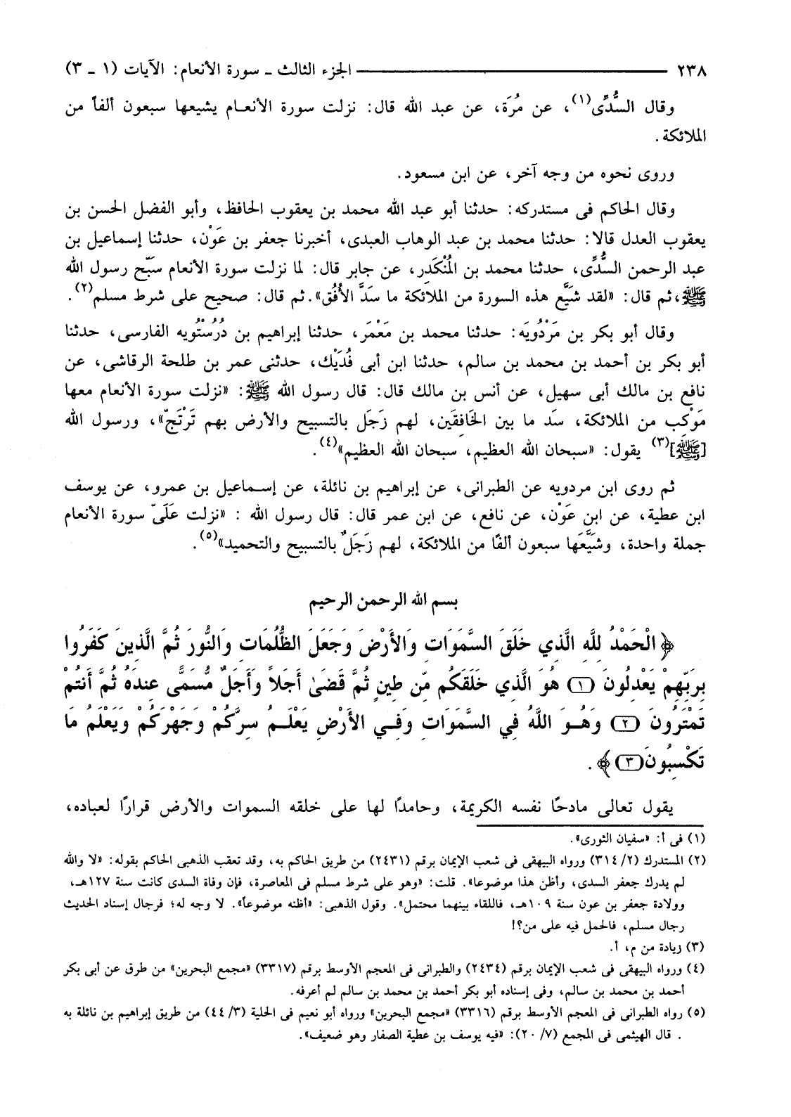 وَقَالَ الْحَاكِمُ فِي مُسْتَدْرَكِهِ: حَدَّثَنَا أَبُو عَبْدِ اللَّهِ مُحَمَّدُ بْنُ يَعْقُوبَ الْحَافِظُ، وَأَبُو الْفَضْلِ الْحَسَنِ بْنُ يَعْقُوبَ الْعَدْلُ قَالَا حَدَّثَنَا مُحَمَّدُ بْنُ عَبْدِ الْوَهَّابِ الْعَبْدِيُّ، أَخْبَرَنَا جَعْفَرُ بْنُ عَوْن، حَدَّثَنَا إِسْمَاعِيلُ بْنُ عَبْدِ الرَّحْمَنِ السُّدِّي، حَدَّثَنَا مُحَمَّدِ بْنِ المُنْكَدِر، عَنْ جَابِرٍ قَالَ: لَمَّا نَزَلَتْ سُورَةُ الْأَنْعَامِ سَبّح رَسُولُ اللَّهِ صَلَّى اللَّهُ عَلَيْهِ وَسَلَّمَ، ثُمَّ قَالَ: " لَقَدْ شَيَّعَ هَذِهِ السُّورَةَ مِنَ الْمَلَائِكَةِ مَا سَدَّ الْأُفُقَ ". ثُمَّ قَالَ: صَحِيحٌ عَلَى شَرْطِ مُسْلِمٍ (2)