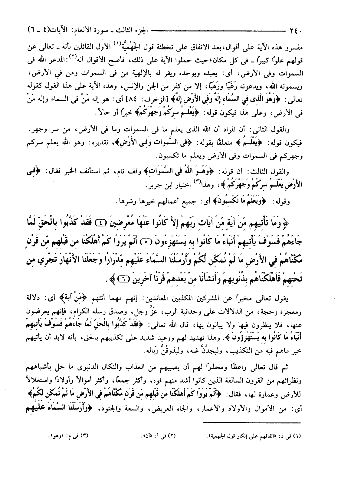 مُفَسِّرُو هَذِهِ الْآيَةِ عَلَى أَقْوَالٍ، بَعْدَ الِاتِّفَاقِ عَلَى تَخْطِئَةِ قَوْلِ الجَهْمِيَّة (1) الْأَوَّلِ الْقَائِلِينَ بِأَنَّهُ -تَعَالَى عَنْ قَوْلِهِمْ عُلُوًّا كَبِيرًا-فِي كُلِّ مَكَانٍ؛ حَيْثُ حَمَلُوا الْآيَةَ عَلَى ذَلِكَ، فَأَصَحُّ الْأَقْوَالِ أَنَّهُ (2) الْمَدْعُوُّ اللَّهُ فِي السَّمَوَاتِ وَفِي الْأَرْضِ، أَيْ: يَعْبُدُهُ وَيُوَحِّدُهُ وَيُقِرُّ لَهُ بِالْإِلَهِيَّةِ مَنْ فِي السَّمَوَاتِ وَمَنْ فِي الْأَرْضِ، وَيُسَمُّونَهُ اللَّهَ، وَيَدْعُونَهُ رَغَبًا ورَهَبًا، إِلَّا مَنْ كَفَرَ مِنَ الْجِنِّ وَالْإِنْسِ، وَهَذِهِ الْآيَةُ عَلَى هَذَا الْقَوْلِ كَقَوْلِهِ تَعَالَى: {وَهُوَ الَّذِي فِي السَّمَاءِ إِلَهٌ وَفِي الأرْضِ إِلَهٌ} [الزُّخْرُفِ: 84] ، أَيْ: هُوَ إِلَهُ مَنْ فِي السَّمَاءِ وَإِلَهُ مَنْ فِي الْأَرْضِ، وَعَلَى هَذَا فَيَكُونُ قَوْلُهُ: {يَعْلَمُ سِرَّكُمْ وَجَهْرَكُمْ} خَبَرًا أَوْ حَالًا.