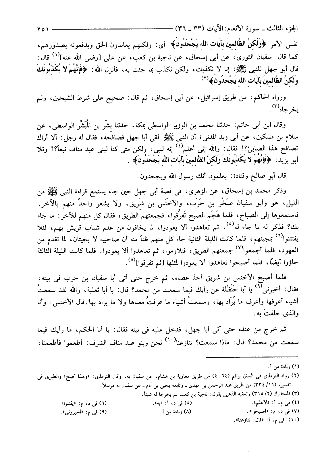 نَفْسِ الْأَمْرِ {وَلَكِنَّ الظَّالِمِينَ بِآيَاتِ اللَّهِ يَجْحَدُونَ} أَيْ: وَلَكِنَّهُمْ يُعَانِدُونَ الْحَقَّ وَيَدْفَعُونَهُ بِصُدُورِهِمْ، كَمَا قَالَ سُفْيَانُ الثَّوْرِيُّ، عَنْ أَبِي إِسْحَاقَ، عَنْ نَاجِيَةَ بْنِ كَعْبٍ، عَنْ عَلِيٍّ [رَضِيَ اللَّهُ عَنْهُ] (1) قَالَ قَالَ: أَبُو جَهْلٍ لِلنَّبِيِّ صَلَّى اللَّهُ عَلَيْهِ وَسَلَّمَ: إِنَّا لَا نُكَذِّبُكَ، وَلَكِنْ نُكَذِّبُ مَا جِئْتَ بِهِ، فَأَنْزَلَ اللَّهُ: {فَإِنَّهُمْ لَا يُكَذِّبُونَكَ وَلَكِنَّ الظَّالِمِينَ بِآيَاتِ اللَّهِ يَجْحَدُونَ} (2)