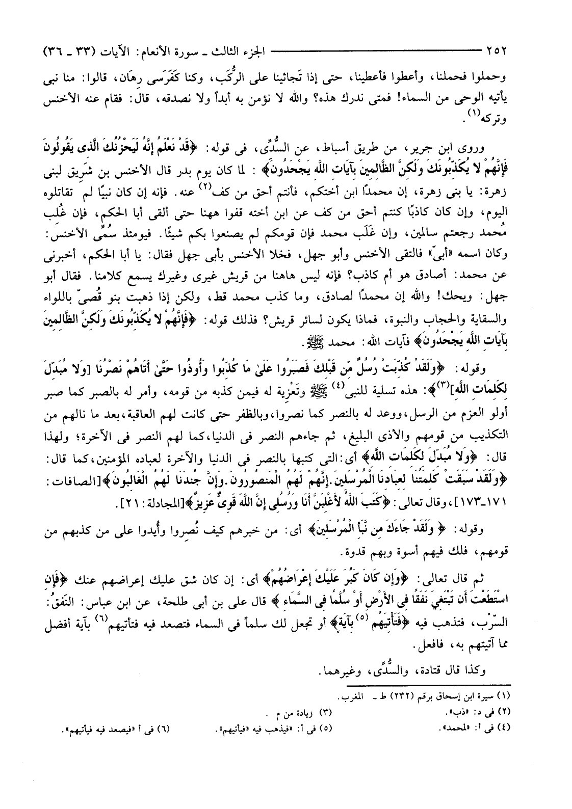 وَرَوَى ابْنُ جَرِيرٍ، مِنْ طَرِيقِ أَسْبَاطٍ، عَنِ السُّدِّي، فِي قَوْلِهِ: {قَدْ نَعْلَمُ إِنَّهُ لَيَحْزُنُكَ الَّذِي يَقُولُونَ فَإِنَّهُمْ لَا يُكَذِّبُونَكَ وَلَكِنَّ الظَّالِمِينَ بِآيَاتِ اللَّهِ يَجْحَدُونَ} لَمَّا كَانَ يَوْمُ بَدْرٍ قَالَ الْأَخْنَسُ بْنُ شَرِيق لِبَنِي زُهْرَةَ: يَا بَنِي زُهْرَةَ، إِنَّ مُحَمَّدًا ابْنُ أُخْتِكُمْ، فَأَنْتُمْ أَحَقُّ مَنْ كَفَّ (2) عَنْهُ. فَإِنَّهُ إِنْ كَانَ نَبِيًّا لَمْ تُقَاتِلُوهُ الْيَوْمَ، وَإِنْ كَانَ كَاذِبًا كُنْتُمْ أَحَقَّ مَنْ كَفَّ عَنِ ابْنِ أُخْتِهِ قِفُوا هَاهُنَا حَتَّى أَلْقَى أَبَا الْحَكَمِ، فَإِنْ غُلِبَ مُحَمَّدٌ رَجَعْتُمْ سَالِمِينَ، وَإِنْ غَلَب مُحَمَّدٌ فَإِنَّ قَوْمَكُمْ لَمْ يَصْنَعُوا بِكُمْ شَيْئًا. فَيَوْمَئِذٍ سُمِّي الْأَخْنَسُ: وَكَانَ اسْمَهُ "أُبَيٌّ" فَالْتَقَى الْأَخْنَسُ وَأَبُو جَهْلٍ، فَخَلَا الْأَخْنَسُ بِأَبِي جَهْلٍ فَقَالَ: يَا أَبَا الْحَكَمِ، أَخْبِرْنِي عَنْ مُحَمَّدٍ: أُصَادِقٌ هُوَ أَمْ كَاذِبٌ؟ فَإِنَّهُ لَيْسَ هَاهُنَا مِنْ قُرَيْشٍ غَيْرِي وَغَيْرُكَ يَسْمَعُ كَلَامَنَا. فَقَالَ أَبُو جَهْلٍ: وَيْحَكَ! وَاللَّهِ إِنَّ مُحَمَّدًا لِصَادِقٌ، وَمَا كَذَبَ مُحَمَّدٌ قَطُّ، وَلَكِنْ إِذَا ذَهَبَتْ بَنُو قُصيّ بِاللِّوَاءِ وَالسِّقَايَةِ وَالْحِجَابِ وَالنُّبُوَّةِ، فَمَاذَا يَكُونُ لِسَائِرِ قُرَيْشٍ؟ فَذَلِكَ قَوْلُهُ: {فَإِنَّهُمْ لَا يُكَذِّبُونَكَ وَلَكِنَّ الظَّالِمِينَ بِآيَاتِ اللَّهِ يَجْحَدُونَ} فَآيَاتُ اللَّهِ: مُحَمَّدٌ صَلَّى اللَّهُ عَلَيْهِ وَسَلَّمَ.