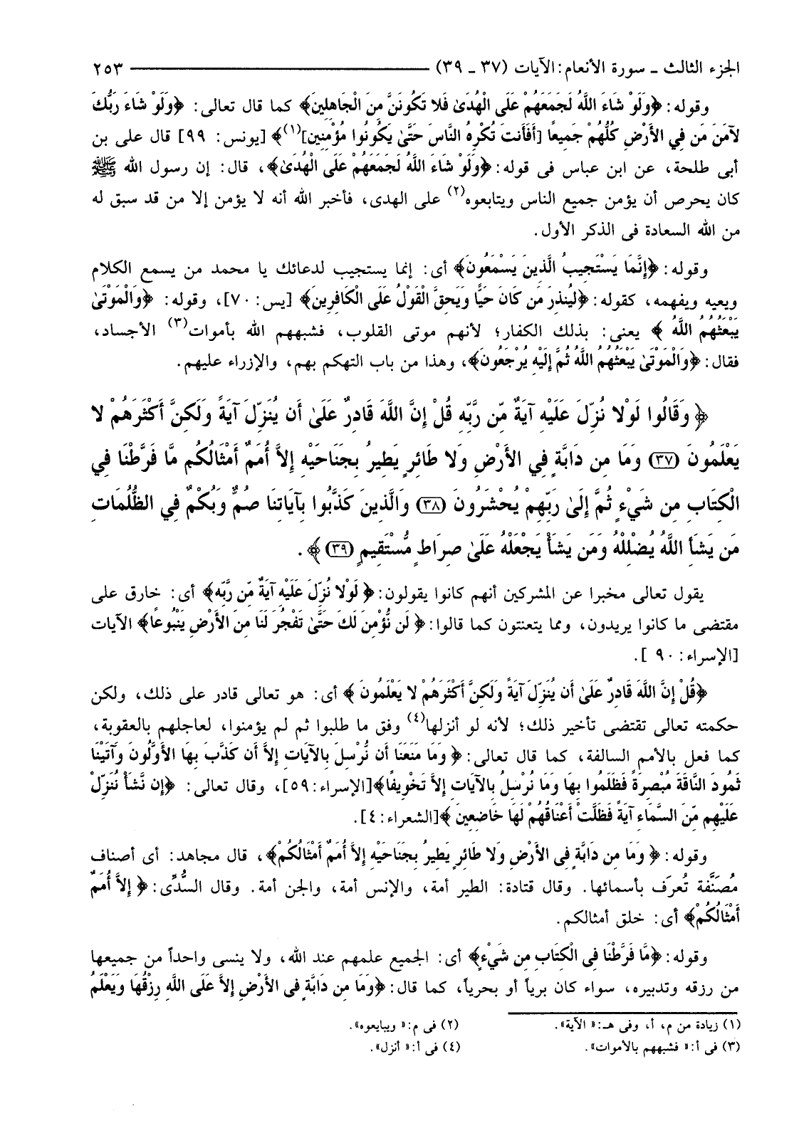 {وَقَالُوا لَوْلا نزلَ عَلَيْهِ آيَةٌ مِنْ رَبِّهِ قُلْ إِنَّ اللَّهَ قَادِرٌ عَلَى أَنْ يُنزلَ آيَةً وَلَكِنَّ أَكْثَرَهُمْ لَا يَعْلَمُونَ (37) وَمَا مِنْ دَابَّةٍ فِي الأرْضِ وَلا طَائِرٍ يَطِيرُ بِجَنَاحَيْهِ إِلا أُمَمٌ أَمْثَالُكُمْ مَا فَرَّطْنَا فِي الْكِتَابِ مِنْ شَيْءٍ ثُمَّ إِلَى رَبِّهِمْ يُحْشَرُونَ (38) وَالَّذِينَ كَذَّبُوا بِآيَاتِنَا صُمٌّ وَبُكْمٌ فِي الظُّلُمَاتِ مَنْ يَشَأِ اللَّهُ يُضْلِلْهُ وَمَنْ يَشَأْ يَجْعَلْهُ عَلَى صِرَاطٍ مُسْتَقِيمٍ (39) }