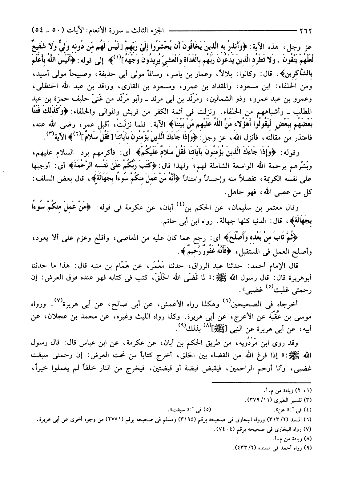 عَزَّ وَجَلَّ، هَذِهِ الْآيَةَ: {وَأَنْذِرْ بِهِ الَّذِينَ يَخَافُونَ أَنْ يُحْشَرُوا إِلَى رَبِّهِمْ [لَيْسَ لَهُمْ مِنْ دُونِهِ وَلِيٌّ وَلا شَفِيعٌ لَعَلَّهُمْ يَتَّقُونَ * وَلا تَطْرُدِ الَّذِينَ يَدْعُونَ رَبَّهُمْ بِالْغَدَاةِ وَالْعَشِيِّ يُرِيدُونَ وَجْهَهُ] } (1) إِلَى قَوْلِهِ: {أَلَيْسَ اللَّهُ بِأَعْلَمَ بِالشَّاكِرِينَ} قَالَ: وَكَانُوا بِلَالًا وَعَمَّارَ بْنَ يَاسِرٍ، وَسَالِمًا مَوْلَى أَبِي حُذَيْفَةَ، وَصُبَيْحًا مَوْلَى أُسَيْدٍ، وَمِنَ الْحُلَفَاءِ: ابْنُ مَسْعُودٍ، وَالْمِقْدَادُ بْنُ عَمْرٍو، وَمَسْعُودُ بْنُ الْقَارِّيِّ، وَوَاقِدُ بْنُ عَبْدِ اللَّهِ الْحَنْظَلِيُّ، وَعَمْرُو بْنُ عَبْدِ عَمْرٍو، وَذُو الشِّمَالَيْنِ، وَمَرْثَدُ بْنُ أَبِي مَرْثَدٍ -وَأَبُو مَرْثَدٍ مِنْ غَنِيٍّ حَلِيفِ حَمْزَةَ بْنِ عَبْدِ الْمُطَّلِبِ -وَأَشْبَاهُهُمْ مِنَ الْحُلَفَاءِ. وَنَزَلَتْ فِي أَئِمَّةِ الْكُفْرِ مِنْ قُرَيْشٍ وَالْمَوَالِي وَالْحُلَفَاءِ: {وَكَذَلِكَ فَتَنَّا بَعْضَهُمْ بِبَعْضٍ لِيَقُولُوا أَهَؤُلاءِ مَنَّ اللَّهُ عَلَيْهِمْ مِنْ بَيْنِنَا} الْآيَةَ. فَلَمَّا نَزَلَتْ، أَقْبَلَ عُمَرُ، رَضِيَ اللَّهُ عَنْهُ، فَاعْتَذَرَ مِنْ مَقَالَتِهِ، فَأَنْزَلَ اللَّهُ، عَزَّ وَجَلَّ: {وَإِذَا جَاءَكَ الَّذِينَ يُؤْمِنُونَ بِآيَاتِنَا [فَقُلْ سَلامٌ] } (2) الْآيَةَ (3)