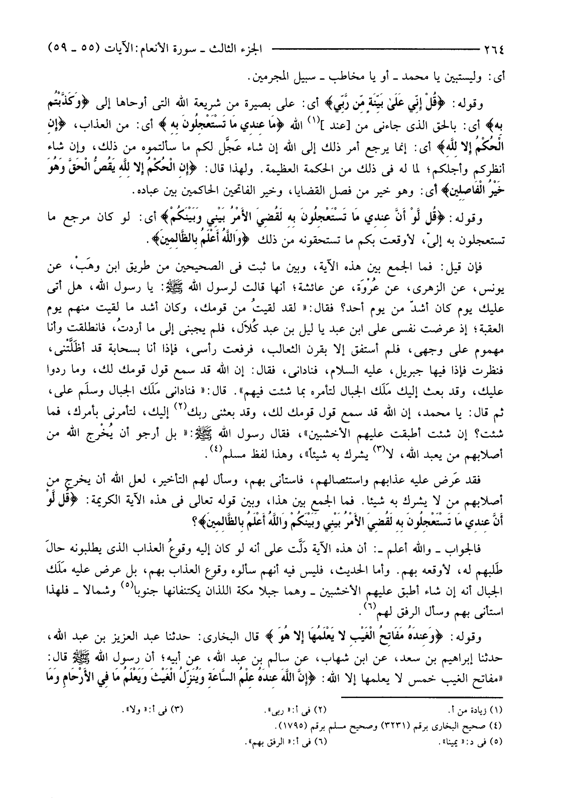 وَقَوْلُهُ: {قُلْ إِنِّي عَلَى بَيِّنَةٍ مِنْ رَبِّي} أَيْ: عَلَى بَصِيرَةٍ مِنْ شَرِيعَةِ اللَّهِ الَّتِي أَوْحَاهَا إِلَيَّ {وَكَذَّبْتُمْ بِهِ} أَيْ: بِالْحَقِّ الَّذِي جَاءَنِي مِنْ [عِنْدِ] (1) اللَّهِ {مَا عِنْدِي مَا تَسْتَعْجِلُونَ بِهِ} أَيْ: مِنَ الْعَذَابِ، {إِنِ الْحُكْمُ إِلا لِلَّهِ} أَيْ: إِنَّمَا يَرْجِعُ أَمْرُ ذَلِكَ إِلَى اللَّهِ إِنْ شَاءَ عَجَّل لَكُمْ مَا سَأَلْتُمُوهُ مِنْ ذَلِكَ، وَإِنْ شَاءَ أَنْظَرَكُمْ وَأَجَّلَكُمْ؛ لِمَا لَهُ فِي ذَلِكَ مِنَ الْحِكْمَةِ الْعَظِيمَةِ. وَلِهَذَا قَالَ {إِنِ الْحُكْمُ إِلا لِلَّهِ يَقُصُّ الْحَقَّ وَهُوَ خَيْرُ الْفَاصِلِينَ} أَيْ: وَهُوَ خَيْرُ مَنْ فَصَلَ الْقَضَايَا، وَخَيْرُ الْفَاتِحِينَ الْحَاكِمِينَ بَيْنَ عِبَادِهِ.