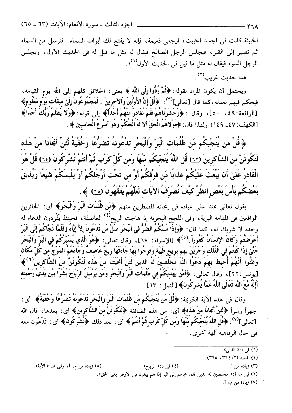 وَقَالَ فِي هَذِهِ الْآيَةِ الْكَرِيمَةِ: {قُلْ مَنْ يُنَجِّيكُمْ مِنْ ظُلُمَاتِ الْبَرِّ وَالْبَحْرِ تَدْعُونَهُ تَضَرُّعًا وَخُفْيَةً} أَيْ: جَهْرًا وَسِرًّا {لَئِنْ أَنْجَانَا مِنْ هَذِهِ} أَيْ: مِنْ هَذِهِ الضَّائِقَةِ {لَنَكُونَنَّ مِنَ الشَّاكِرِينَ} أَيْ: بَعْدَهَا، قَالَ اللَّهُ [تَعَالَى] (7) {قُلِ اللَّهُ يُنَجِّيكُمْ مِنْهَا وَمِنْ كُلِّ كَرْبٍ ثُمَّ أَنْتُمْ} أَيْ: بَعْدَ ذَلِكَ {تُشْرِكُونَ} أَيْ: تَدْعُونَ مَعَهُ فِي حَالِ الرَّفَاهِيَةِ آلهة أخرى.