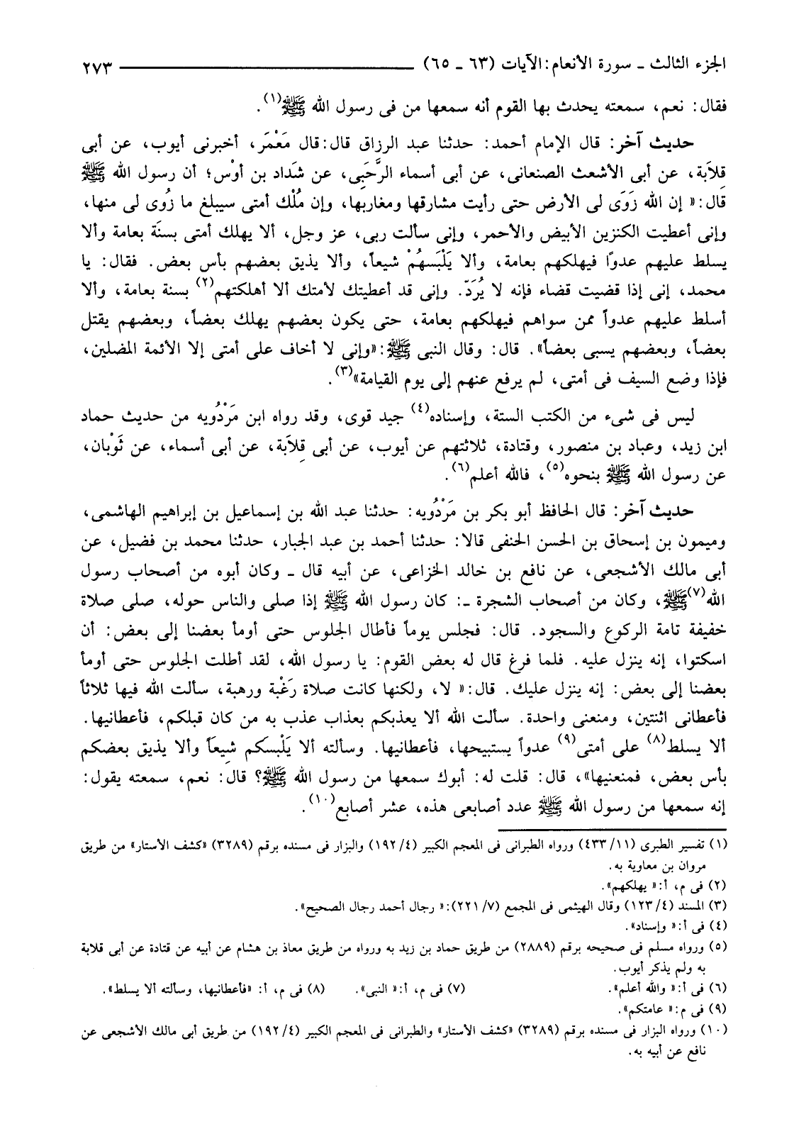 لَيْسَ فِي شَيْءٍ مِنَ الْكُتُبِ السِّتَّةِ، وَإِسْنَادُهُ (4) جَيِّدٌ قَوِيٌّ، وَقَدْ رَوَاهُ ابْنُ مَرْدُوَيه مِنْ حَدِيثِ حَمَّادِ ابن زَيْدٍ، وَعَبَّادِ بْنِ مَنْصُورٍ، وَقَتَادَةَ، ثَلَاثَتُهُمْ عَنْ أَيُّوبَ، عَنْ أَبِي قِلَابَةَ، عَنْ أَبِي أَسْمَاءَ، عَنْ ثَوْبان، عَنْ رَسُولِ اللَّهِ صَلَّى اللَّهُ عَلَيْهِ وَسَلَّمَ بِنَحْوِهِ (5) فَاللَّهُ أَعْلَمُ (6)