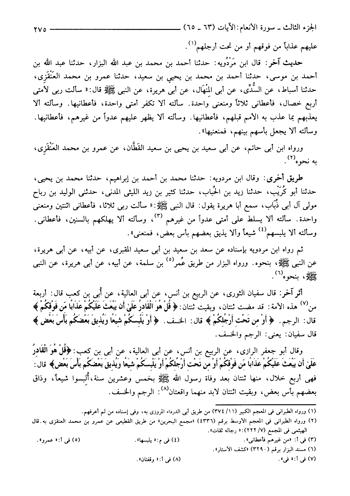 أَثَرٌ آخَرُ: قَالَ سُفْيَانُ، الثَّوْرِيُّ عَنِ الرَّبِيعِ بْنِ أَنَسٍ، عَنْ أَبِي الْعَالِيَةِ، عَنْ أُبَيِّ بْنِ كَعْبٍ قَالَ: أَرْبَعَةٌ مِنْ (7) هَذِهِ الْأُمَّةِ: قَدْ مَضَتْ ثِنْتَانِ، وَبَقِيَتْ ثِنْتَانِ: {قُلْ هُوَ الْقَادِرُ عَلَى أَنْ يَبْعَثَ عَلَيْكُمْ عَذَابًا مِنْ فَوْقِكُمْ} قَالَ: الرَّجْمُ. {أَوْ مِنْ تَحْتِ أَرْجُلِكُمْ} قَالَ: الْخَسْفُ. {أَوْ يَلْبِسَكُمْ شِيَعًا وَيُذِيقَ بَعْضَكُمْ بَأْسَ بَعْضٍ} قَالَ سُفْيَانُ: يَعْنِي: الرَّجْمَ وَالْخَسْفَ.