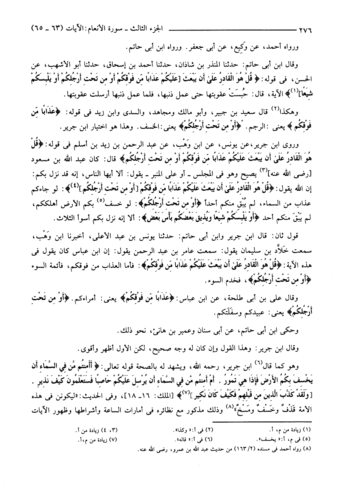 وَرَوَاهُ ابْنُ جَرِيرٍ، عَنْ يُونُسَ، عَنِ ابْنِ وَهْب، عَنْ عَبْدِ الرَّحْمَنِ بْنِ زَيْدِ بْنِ أَسْلَمَ فِي قوله: {قُلْ هُوَ الْقَادِرُ عَلَى أَنْ يَبْعَثَ عَلَيْكُمْ عَذَابًا مِنْ فَوْقِكُمْ أَوْ مِنْ تَحْتِ أَرْجُلِكُمْ} قَالَ: كَانَ عَبْدِ اللَّهِ بْنِ مَسْعُودٍ [رَضِيَ اللَّهُ عَنْهُ] (3) يَصِيحُ وَهُوَ فِي الْمَجْلِسِ -أَوْ عَلَى الْمِنْبَرِ -يَقُولُ: أَلَا أَيُّهَا النَّاسُ، إِنَّهُ قَدْ نَزَلَ بِكُمْ.