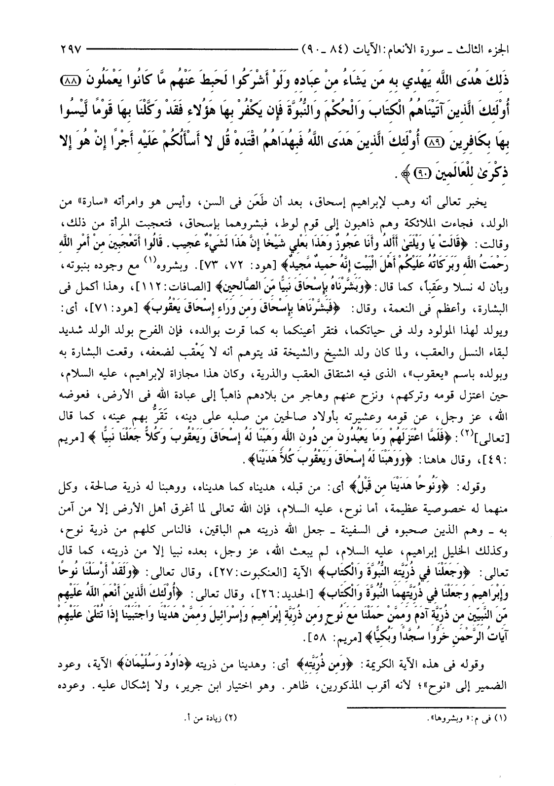 {وَوَهَبْنَا لَهُ إِسْحَاقَ وَيَعْقُوبَ كُلا هَدَيْنَا وَنُوحًا هَدَيْنَا مِنْ قَبْلُ وَمِنْ ذُرِّيَّتِهِ دَاوُدَ وَسُلَيْمَانَ وَأَيُّوبَ وَيُوسُفَ وَمُوسَى وَهَارُونَ وَكَذَلِكَ نَجْزِي الْمُحْسِنِينَ (84) وَزَكَرِيَّا وَيَحْيَى وَعِيسَى وَإِلْيَاسَ كُلٌّ مِنَ الصَّالِحِينَ (85) وَإِسْمَاعِيلَ وَالْيَسَعَ وَيُونُسَ وَلُوطًا وَكُلا فَضَّلْنَا عَلَى الْعَالَمِينَ (86) وَمِنْ آبَائِهِمْ وَذُرِّيَّاتِهِمْ وَإِخْوَانِهِمْ وَاجْتَبَيْنَاهُمْ وَهَدَيْنَاهُمْ إِلَى صِرَاطٍ مُسْتَقِيمٍ (87) ذَلِكَ هُدَى اللَّهِ يَهْدِي بِهِ مَنْ يَشَاءُ مِنْ عِبَادِهِ وَلَوْ أَشْرَكُوا لَحَبِطَ عَنْهُمْ مَا كَانُوا يَعْمَلُونَ (88) أُولَئِكَ الَّذِينَ آتَيْنَاهُمُ الْكِتَابَ وَالْحُكْمَ وَالنُّبُوَّةَ فَإِنْ يَكْفُرْ بِهَا هَؤُلاءِ فَقَدْ وَكَّلْنَا بِهَا قَوْمًا لَيْسُوا بِهَا بِكَافِرِينَ (89) أُولَئِكَ الَّذِينَ هَدَى اللَّهُ فَبِهُدَاهُمُ اقْتَدِهِ قُلْ لَا أَسْأَلُكُمْ عَلَيْهِ أَجْرًا إِنْ هُوَ إِلا ذِكْرَى لِلْعَالَمِينَ (90) }