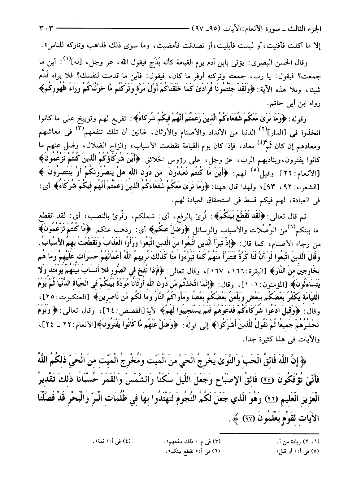 ثُمَّ قَالَ تَعَالَى: {لَقَدْ تَقَطَّعَ بَيْنَكُمْ} قُرئ بِالرَّفْعِ، أَيْ شَمْلُكُمْ، وقُرئ بِالنَّصْبِ، أَيْ: لَقَدِ انْقَطَعَ مَا بَيْنَكُمْ (6) مِنَ الوُصُلات وَالْأَسْبَابِ وَالْوَسَائِلِ {وَضَلَّ عَنْكُمْ} أَيْ: وَذَهَبَ عَنْكُمْ {مَا كُنْتُمْ تَزْعُمُونَ} مِنْ رَجَاءِ الْأَصْنَامِ، كَمَا قَالَ: {إِذْ تَبَرَّأَ الَّذِينَ اتُّبِعُوا مِنَ الَّذِينَ اتَّبَعُوا وَرَأَوُا الْعَذَابَ وَتَقَطَّعَتْ بِهِمُ الأسْبَابُ * وَقَالَ الَّذِينَ اتَّبَعُوا لَوْ أَنَّ لَنَا كَرَّةً فَنَتَبَرَّأَ مِنْهُمْ كَمَا تَبَرَّءُوا مِنَّا كَذَلِكَ يُرِيهِمُ اللَّهُ أَعْمَالَهُمْ حَسَرَاتٍ عَلَيْهِمْ وَمَا هُمْ بِخَارِجِينَ مِنَ النَّارِ} [الْبَقَرَةِ: 166، 167] ، وَقَالَ تَعَالَى: {فَإِذَا نُفِخَ فِي الصُّورِ فَلا أَنْسَابَ بَيْنَهُمْ يَوْمَئِذٍ وَلا يَتَسَاءَلُونَ} [الْمُؤْمِنُونَ: 101] ، وَقَالَ {إِنَّمَا اتَّخَذْتُمْ مِنْ دُونِ اللَّهِ أَوْثَانًا مَوَدَّةَ بَيْنِكُمْ فِي الْحَيَاةِ الدُّنْيَا ثُمَّ يَوْمَ الْقِيَامَةِ يَكْفُرُ بَعْضُكُمْ بِبَعْضٍ وَيَلْعَنُ بَعْضُكُمْ بَعْضًا وَمَأْوَاكُمُ النَّارُ وَمَا لَكُمْ مِنْ نَاصِرِينَ} [الْعَنْكَبُوتِ: 25] ، وَقَالَ {وَقِيلَ ادْعُوا شُرَكَاءَكُمْ فَدَعَوْهُمْ فَلَمْ يَسْتَجِيبُوا لَهُمْ} الْآيَةَ [الْقَصَصِ: 64] ، وَقَالَ تَعَالَى: {وَيَوْمَ نَحْشُرُهُمْ جَمِيعًا ثُمَّ نَقُولُ لِلَّذِينَ أَشْرَكُوا} إِلَى قَوْلِهِ: {وَضَلَّ عَنْهُمْ مَا كَانُوا يَفْتَرُونَ} [الْأَنْعَامِ: 22 -24] ، وَالْآيَاتُ فِي هَذَا كثيرة جدا.