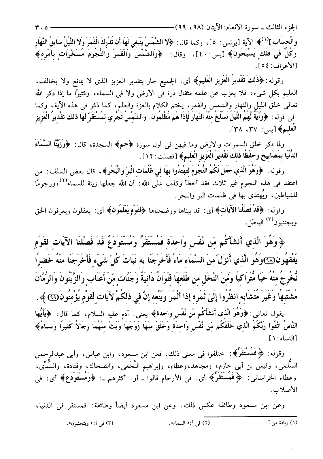 وَقَوْلُهُ: {وَهُوَ الَّذِي جَعَلَ لَكُمُ النُّجُومَ لِتَهْتَدُوا بِهَا فِي ظُلُمَاتِ الْبَرِّ وَالْبَحْرِ} قَالَ بَعْضُ السَّلَفِ: مَنِ اعْتَقَدَ فِي هَذِهِ النُّجُومِ غَيْرَ ثَلَاثٍ فَقَدْ أَخْطَأَ وَكَذَبَ عَلَى اللَّهِ: أَنَّ اللَّهَ جَعَلَهَا زِينَةً لِلسَّمَاءِ (1) وَرُجُومًا لِلشَّيَاطِينِ، وَيُهْتَدَى بِهَا فِي ظُلُمَاتِ الْبَرِّ وَالْبَحْرِ.