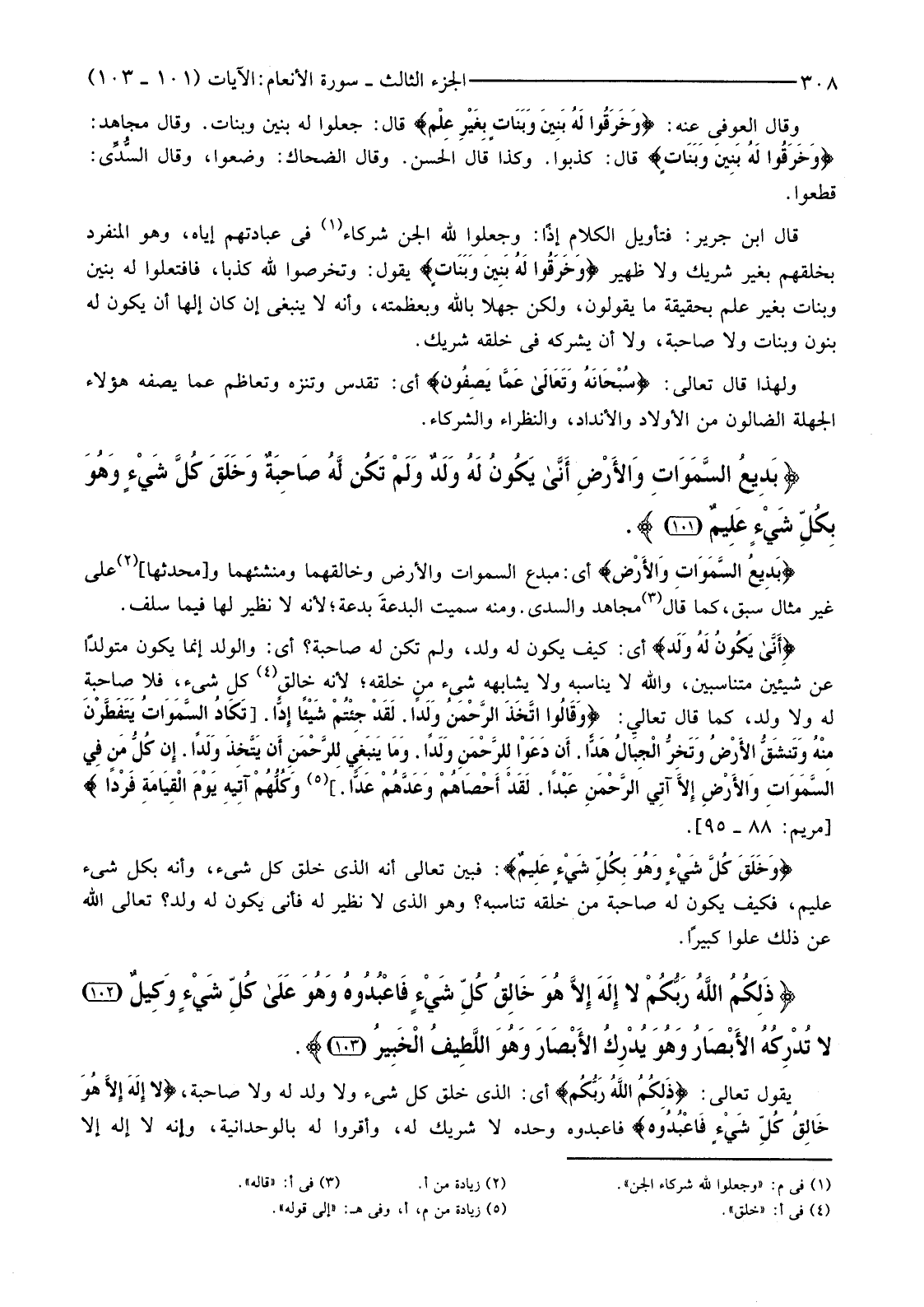 قَالَ ابْنُ جَرِيرٍ: فَتَأْوِيلُ الْكَلَامِ إِذًا: وَجَعَلُوا لِلَّهِ الْجِنَّ شُرَكَاءَ (1) فِي عِبَادَتِهِمْ إِيَّاهُ، وَهُوَ الْمُنْفَرِدُ بِخَلْقِهِمْ بِغَيْرِ شَرِيكٍ وَلَا ظَهِيرٍ {وَخَرَقُوا لَهُ بَنِينَ وَبَنَاتٍ} يَقُولُ: وَتَخَرَّصُوا لِلَّهِ كَذِبًا، فَافْتَعَلُوا لَهُ بَنِينَ وَبَنَاتٍ بِغَيْرِ عِلْمٍ بِحَقِيقَةِ مَا يَقُولُونَ، وَلَكِنْ جَهْلًا بِاللَّهِ وَبِعَظَمَتِهِ، وَأَنَّهُ لَا يَنْبَغِي إِنْ كَانَ إِلَهًا أَنْ يَكُونَ لَهُ بَنُونَ وَبَنَاتٌ وَلَا صَاحِبَةٌ، وَلَا أَنْ يُشْرِكَهُ فِي خَلْقِهِ شَرِيكٌ.