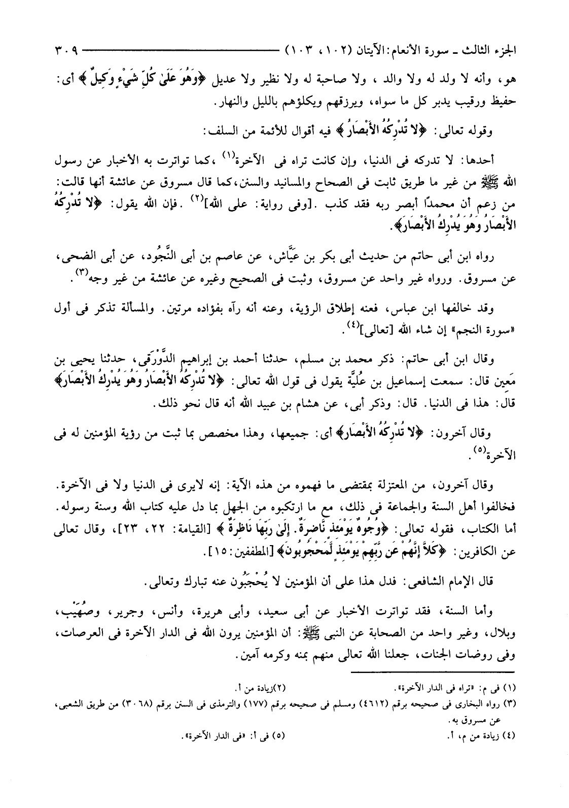 وَقَوْلُهُ تَعَالَى: {لَا تُدْرِكُهُ الأبْصَارُ} فِيهِ أَقْوَالٌ لِلْأَئِمَّةِ مِنَ السَّلَفِ: