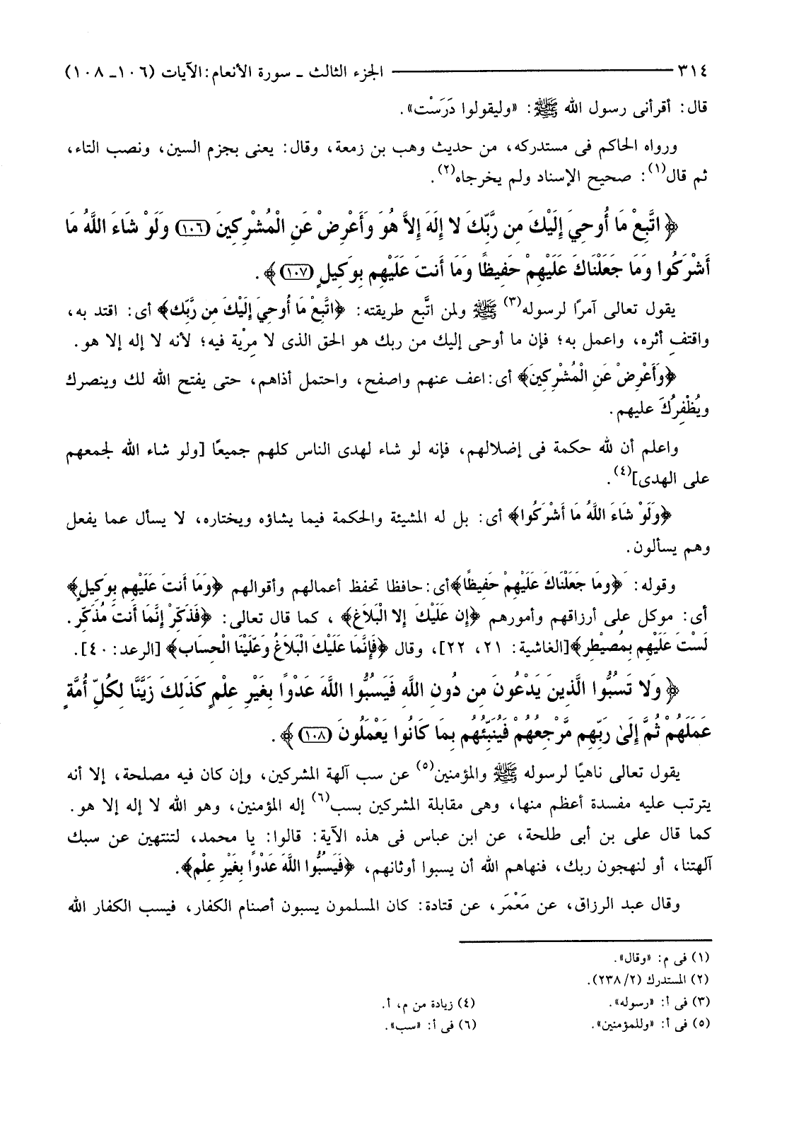 {اتَّبِعْ مَا أُوحِيَ إِلَيْكَ مِنْ رَبِّكَ لَا إِلَهَ إِلا هُوَ وَأَعْرِضْ عَنِ الْمُشْرِكِينَ (106) وَلَوْ شَاءَ اللَّهُ مَا أَشْرَكُوا وَمَا جَعَلْنَاكَ عَلَيْهِمْ حَفِيظًا وَمَا أَنْتَ عَلَيْهِمْ بِوَكِيلٍ (107) }