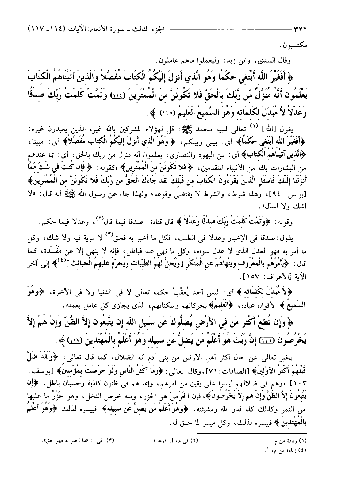 {أَفَغَيْرَ اللَّهِ أَبْتَغِي حَكَمًا وَهُوَ الَّذِي أَنزلَ إِلَيْكُمُ الْكِتَابَ مُفَصَّلا وَالَّذِينَ آتَيْنَاهُمُ الْكِتَابَ يَعْلَمُونَ أَنَّهُ مُنزلٌ مِنْ رَبِّكَ بِالْحَقِّ فَلا تَكُونَنَّ مِنَ الْمُمْتَرِينَ (114) وَتَمَّتْ كَلِمَةُ رَبِّكَ صِدْقًا وَعَدْلا لَا مُبَدِّلَ لِكَلِمَاتِهِ وَهُوَ السَّمِيعُ الْعَلِيمُ (115) }
