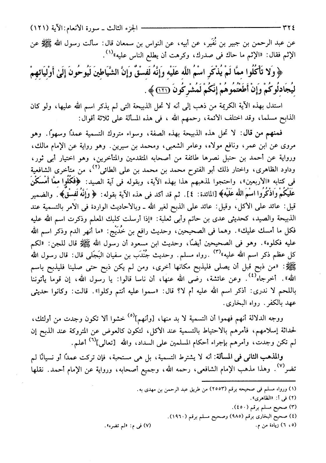 {وَلا تَأْكُلُوا مِمَّا لَمْ يُذْكَرِ اسْمُ اللَّهِ عَلَيْهِ وَإِنَّهُ لَفِسْقٌ وَإِنَّ الشَّيَاطِينَ لَيُوحُونَ إِلَى أَوْلِيَائِهِمْ لِيُجَادِلُوكُمْ وَإِنْ أَطَعْتُمُوهُمْ إِنَّكُمْ لَمُشْرِكُونَ (121) }