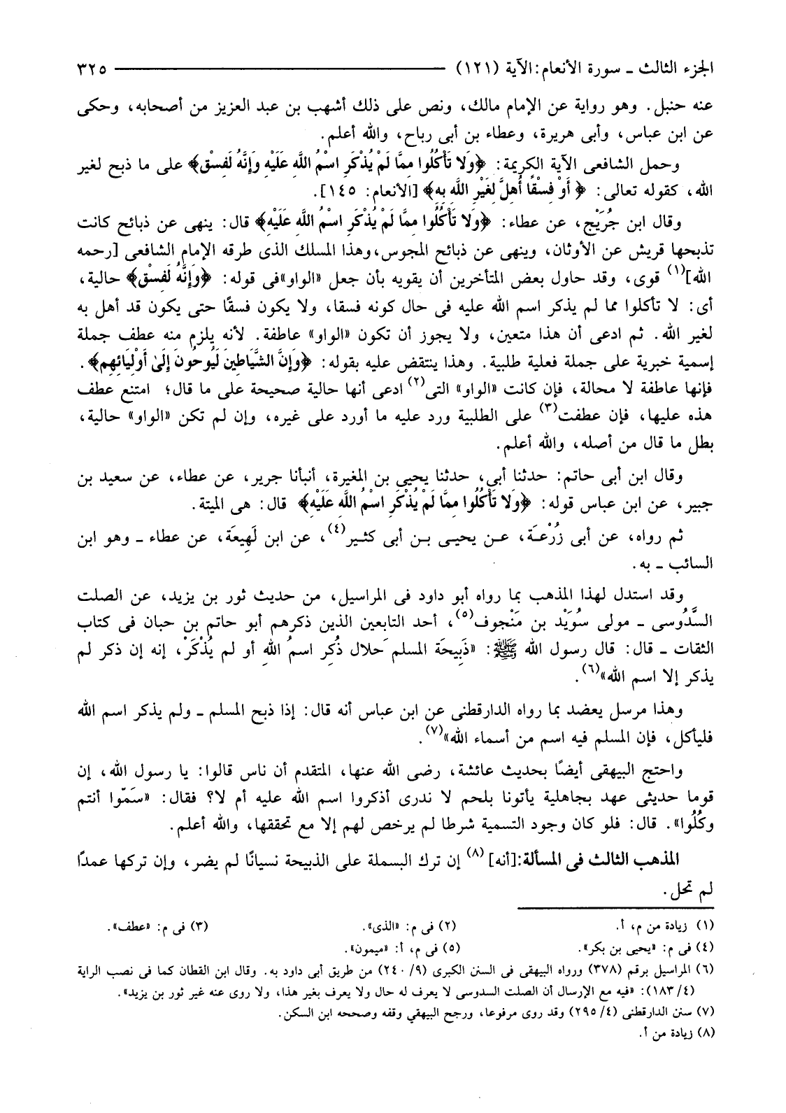 وَقَالَ ابْنُ جُرَيْج، عَنْ عَطَاءٍ: {وَلا تَأْكُلُوا مِمَّا لَمْ يُذْكَرِ اسْمُ اللَّهِ عَلَيْهِ} قَالَ: يَنْهَى عَنْ ذَبَائِحَ كَانَتْ تَذْبَحُهَا قُرَيْشٌ عَنِ الْأَوْثَانِ، وَيَنْهَى عَنْ ذَبَائِحِ الْمَجُوسِ، وَهَذَا الْمَسْلَكُ الَّذِي طَرَقَهُ الْإِمَامُ الشَّافِعِيِّ [رَحِمَهُ اللَّهُ] (1) قَوِيٌّ، وَقَدْ حَاوَلَ بَعْضُ الْمُتَأَخِّرِينَ أَنْ يُقَوِّيَهُ بِأَنْ جَعَلَ "الْوَاوَ" فِي قَوْلِهِ: {وإِنَّهُ لَفِسْقٌ} حَالِيَّةً، أَيْ: لَا تَأْكُلُوا مِمَّا لَمْ يُذْكَرِ اسْمُ اللَّهِ عَلَيْهِ فِي حَالِ كَوْنِهِ فِسْقًا، وَلَا يَكُونُ فِسْقًا حَتَّى يَكُونَ قَدْ أُهِلَّ بِهِ لِغَيْرِ اللَّهِ. ثُمَّ ادَّعَى أَنَّ هَذَا مُتَعَيَّنٌ، وَلَا يَجُوزُ أَنْ تَكُونَ "الْوَاوُ" عَاطِفَةً. لِأَنَّهُ يَلْزَمُ مِنْهُ عَطْفُ جُمْلَةٍ إِسْمِيَّةٍ خَبَرِيَّةٍ عَلَى جُمْلَةٍ فِعْلِيَّةٍ طَلَبِيَّةٍ. وَهَذَا يَنْتَقِضُ عَلَيْهِ بِقَوْلِهِ: {وَإِنَّ الشَّيَاطِينَ لَيُوحُونَ إِلَى أَوْلِيَائِهِمْ} فَإِنَّهَا عَاطِفَةٌ لا محاولة، فَإِنْ كَانَتِ "الْوَاوُ" الَّتِي (2) ادَّعَى أَنَّهَا حَالِيَّةٌ صَحِيحَةٌ عَلَى مَا قَالَ؛ امْتَنَعَ عَطْفُ هَذِهِ عَلَيْهَا، فَإِنْ عُطِفَتْ (3) عَلَى الطَّلَبِيَّةِ وَرَدَ عَلَيْهِ مَا أَوْرَدَ عَلَى غَيْرِهِ، وَإِنْ لَمْ تَكُنْ "الْوَاوُ" حَالِيَّةً، بَطَلَ مَا قَالَ مِنْ أَصْلِهِ، وَاللَّهُ أَعْلَمُ.
