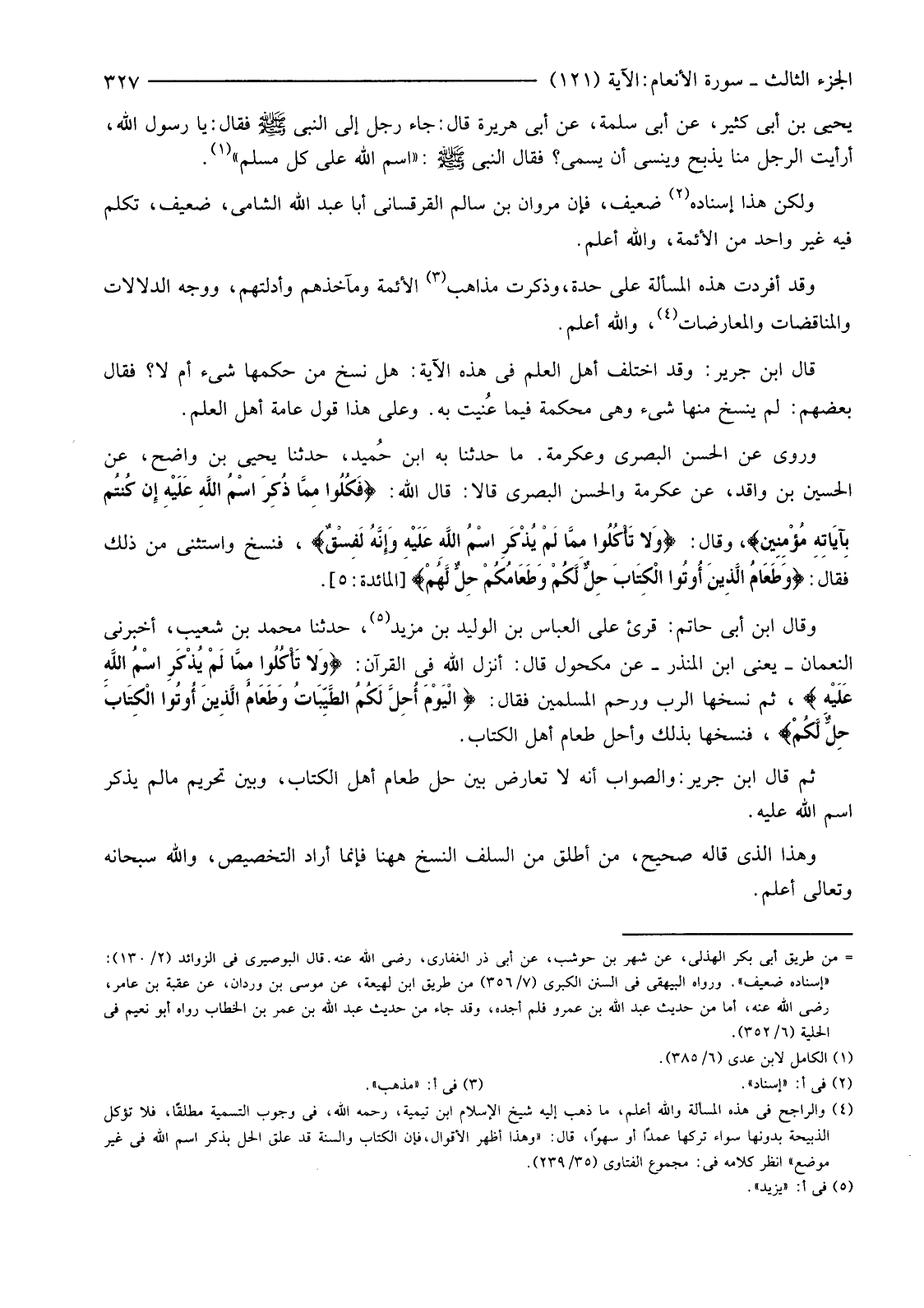 ثُمَّ قَالَ ابْنُ جَرِيرٍ: وَالصَّوَابُ أَنَّهُ لَا تَعَارُضَ بَيْنَ حِلِّ طَعَامِ أَهْلِ الْكِتَابِ، وَبَيْنَ تَحْرِيمِ مَا لَمْ يُذْكَرِ اسْمُ اللَّهِ عَلَيْهِ.
