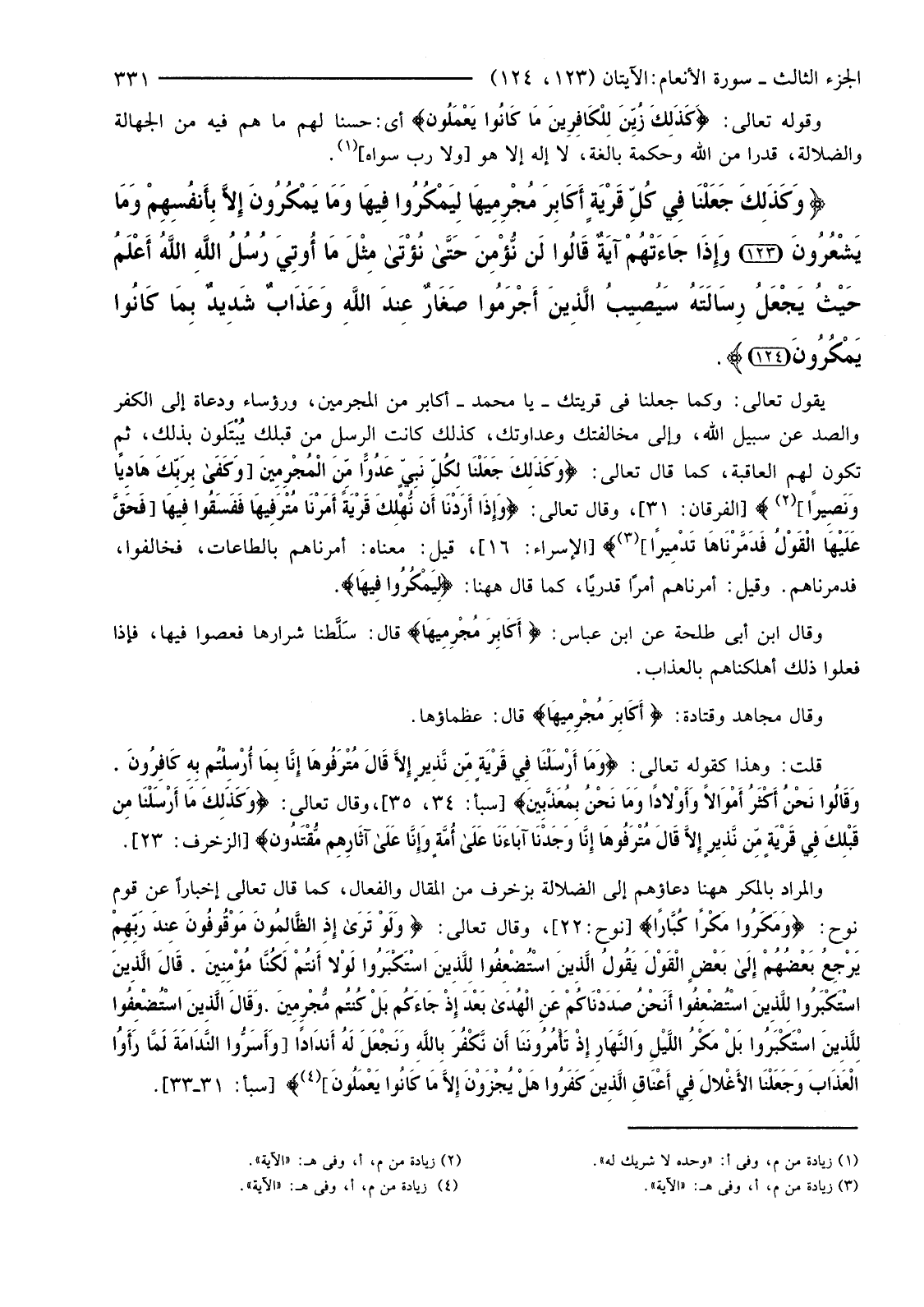 وَقَالَ مُجَاهِدٌ وَقَتَادَةُ: {أَكَابِرَ مُجْرِمِيهَا} قَالَ عُظَمَاؤُهَا.