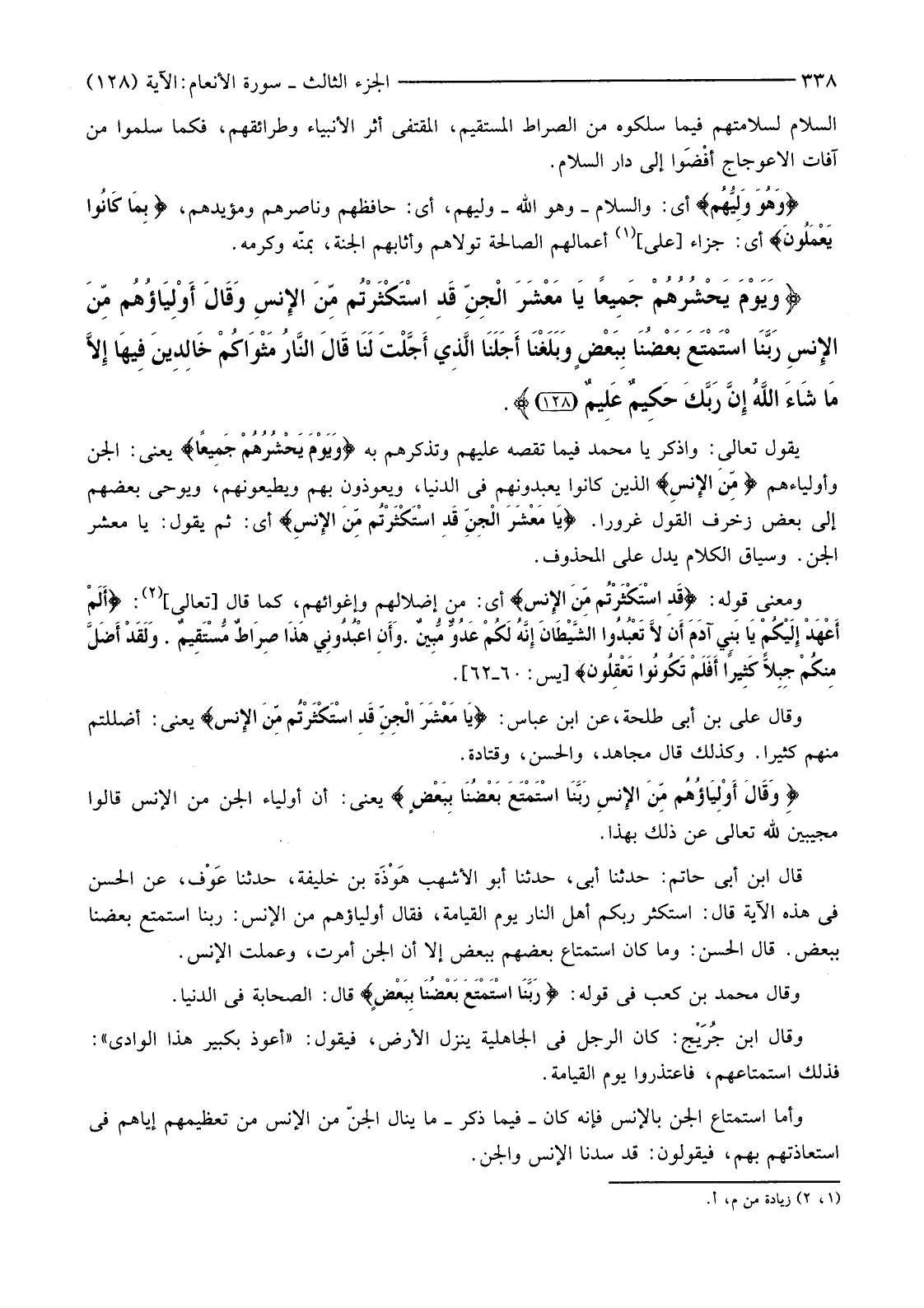 {وَيَوْمَ يَحْشُرُهُمْ جَمِيعًا يَا مَعْشَرَ الْجِنِّ قَدِ اسْتَكْثَرْتُمْ مِنَ الإنْسِ وَقَالَ أَوْلِيَاؤُهُمْ مِنَ الإنْسِ رَبَّنَا اسْتَمْتَعَ بَعْضُنَا بِبَعْضٍ وَبَلَغْنَا أَجَلَنَا الَّذِي أَجَّلْتَ لَنَا قَالَ النَّارُ مَثْوَاكُمْ خَالِدِينَ فِيهَا إِلا مَا شَاءَ اللَّهُ إِنَّ رَبَّكَ حَكِيمٌ عَلِيمٌ (128) }