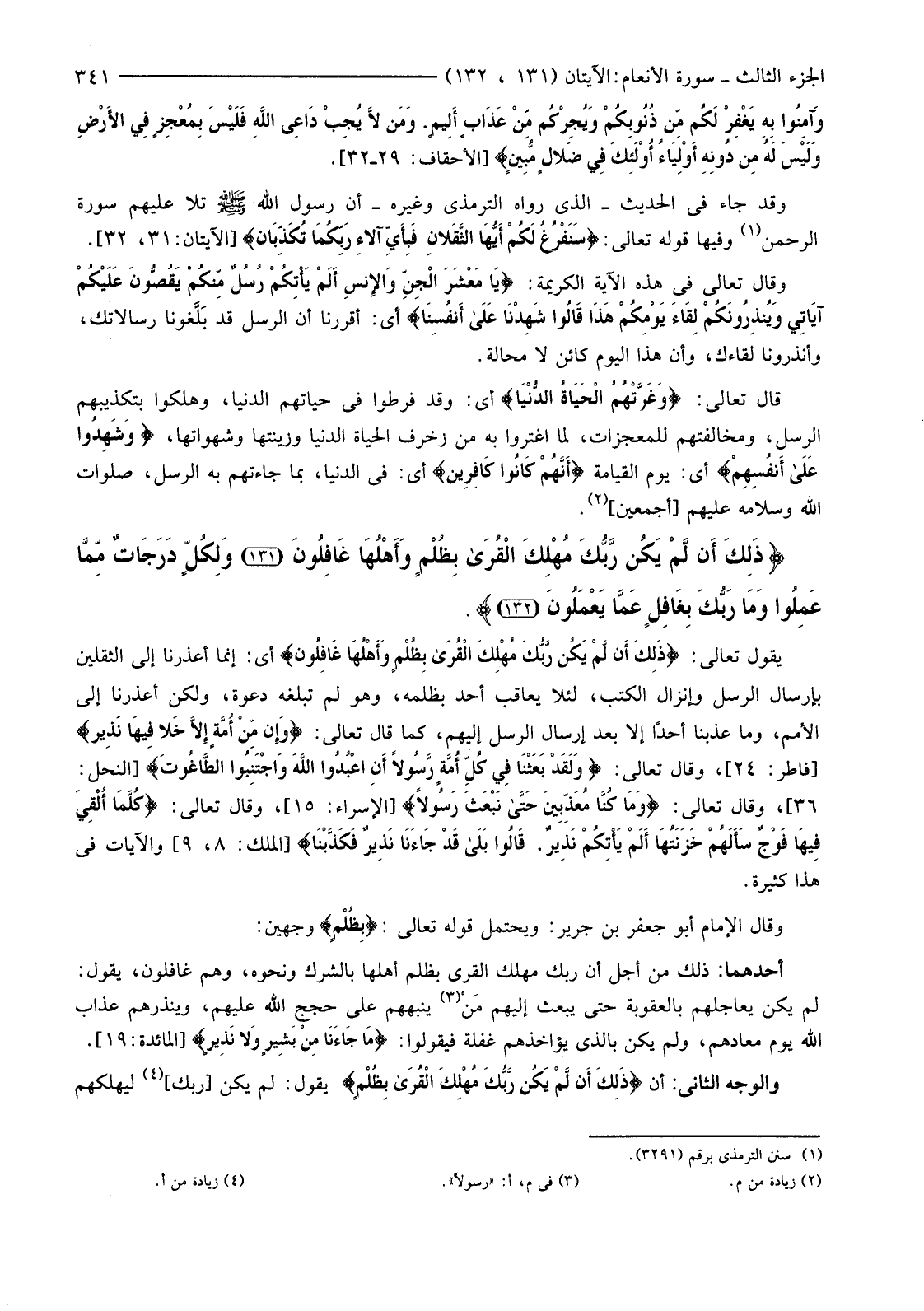 يَقُولُ تَعَالَى: {ذَلِكَ أَنْ لَمْ يَكُنْ رَبُّكَ مُهْلِكَ الْقُرَى بِظُلْمٍ وَأَهْلُهَا غَافِلُونَ} أَيْ: إِنَّمَا أَعْذَرْنَا إِلَى الثَّقَلَيْنِ بِإِرْسَالِ الرُّسُلِ وَإِنْزَالِ الْكُتُبِ، لِئَلَّا يُعَاقَبَ أَحَدٌ بِظُلْمِهِ، وَهُوَ لَمْ تَبْلُغْهُ دَعْوَةٌ، وَلَكِنْ أَعْذَرْنَا إِلَى الْأُمَمِ، وَمَا عَذَّبْنَا أَحَدًا إِلَّا بَعْدَ إِرْسَالِ الرُّسُلِ إِلَيْهِمْ، كَمَا قَالَ تَعَالَى: {وَإِنْ مِنْ أُمَّةٍ إِلا خَلا فِيهَا نَذِيرٌ} [فَاطِرَ: 24] ، وَقَالَ تَعَالَى: {وَلَقَدْ بَعَثْنَا فِي كُلِّ أُمَّةٍ رَسُولا أَنِ اُعْبُدُوا اللَّهَ وَاجْتَنِبُوا الطَّاغُوتَ} [النَّحْلِ: 36] ، وَقَالَ تَعَالَى: {وَمَا كُنَّا مُعَذِّبِينَ حَتَّى نَبْعَثَ رَسُولا} [الْإِسْرَاءِ: 15] ، وَقَالَ تَعَالَى: {كُلَّمَا أُلْقِيَ فِيهَا فَوْجٌ سَأَلَهُمْ خَزَنَتُهَا أَلَمْ يَأْتِكُمْ نَذِيرٌ * قَالُوا بَلَى قَدْ جَاءَنَا نَذِيرٌ فَكَذَّبْنَا} [الْمُلْكِ: 8، 9] وَالْآيَاتُ فِي هَذَا كَثِيرَةٌ.
