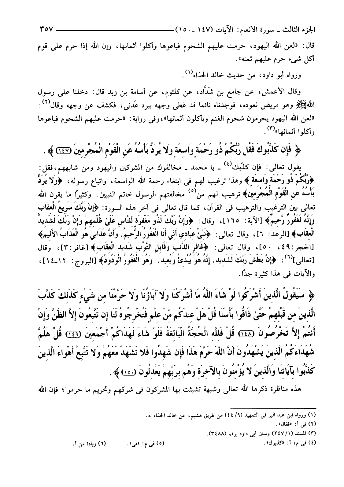 يَقُولُ تَعَالَى: فَإِنْ كَذَّبَكَ (1) -يَا مُحَمَّدُ -مُخَالِفُوكَ مِنَ الْمُشْرِكِينَ وَالْيَهُودِ وَمَنْ شَابَهَهُمْ، فَقُلْ: {رَبُّكُمْ ذُو رَحْمَةٍ وَاسِعَةٍ} وَهَذَا تَرْغِيبٌ لَهُمْ فِي ابْتِغَاءِ رَحْمَةِ اللَّهِ الْوَاسِعَةِ، وَاتِّبَاعِ رَسُولِهِ، {وَلا يُرَدُّ بَأْسُهُ عَنِ الْقَوْمِ الْمُجْرِمِينَ} تَرْهِيبٌ لَهُمْ مِنْ (2) مُخَالَفَتِهِمُ الرَّسُولَ خَاتَمَ النَّبِيِّينَ. وَكَثِيرًا مَا يَقْرِنُ اللَّهُ تَعَالَى بَيْنَ التَّرْغِيبِ وَالتَّرْهِيبِ فِي الْقُرْآنِ، كَمَا قَالَ تَعَالَى فِي آخِرِ هَذِهِ السُّورَةِ: {إِنَّ رَبَّكَ سَرِيعُ الْعِقَابِ وَإِنَّهُ لَغَفُورٌ رَحِيمٌ} [الْآيَةَ: 165] ، وَقَالَ {وَإِنَّ رَبَّكَ لَذُو مَغْفِرَةٍ لِلنَّاسِ عَلَى ظُلْمِهِمْ وَإِنَّ رَبَّكَ لَشَدِيدُ الْعِقَابِ} [الرَّعْدِ: 6] ، وَقَالَ تَعَالَى: {نَبِّئْ عِبَادِي أَنِّي أَنَا الْغَفُورُ الرَّحِيمُ. وَأَنَّ عَذَابِي هُوَ الْعَذَابُ الألِيمُ} [الحجر: 49، 50] ، وَقَالَ تَعَالَى: {غَافِرِ الذَّنْبِ وَقَابِلِ التَّوْبِ شَدِيدِ الْعِقَابِ} [غَافِرَ: 3] ، وَقَالَ [تَعَالَى] (3) : {إِنَّ بَطْشَ رَبِّكَ لَشَدِيدٌ إِنَّهُ هُوَ يُبْدِئُ وَيُعِيدُ وَهُوَ الْغَفُورُ الْوَدُودُ} [الْبُرُوجِ: 12 -14] ، وَالْآيَاتُ فِي هَذَا كَثِيرَةٌ جِدًّا.