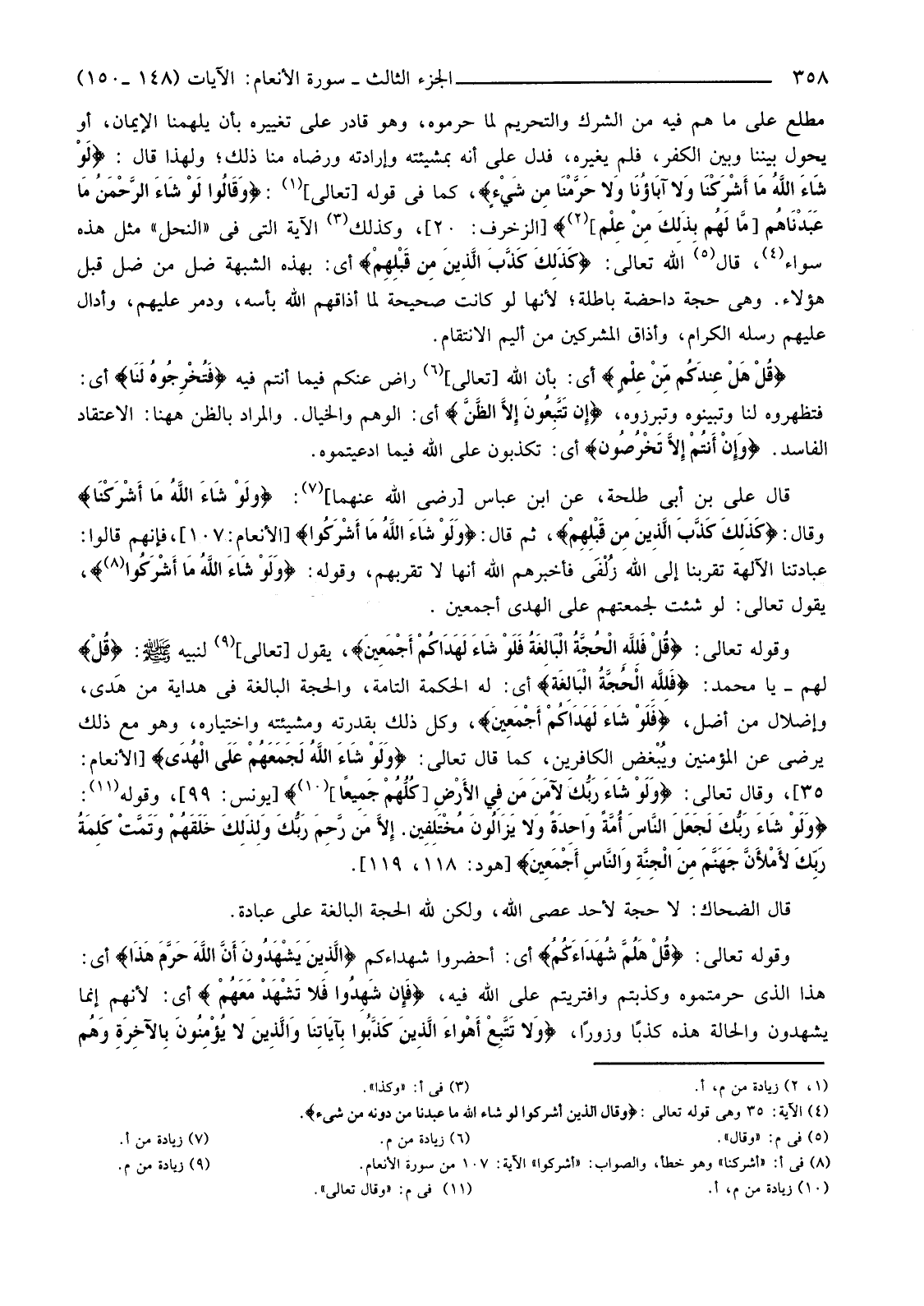 قَالَ عَلِيُّ بْنُ أَبِي طَلْحَةَ، عَنِ ابْنِ عَبَّاسٍ [رَضِيَ اللَّهُ عَنْهُمَا] (7) : {لَوْ شَاءَ اللَّهُ مَا أَشْرَكْنَا} وَقَالَ {كَذَلِكَ كَذَّبَ الَّذِينَ مِنْ قَبْلِهِمْ} ثُمَّ قَالَ {وَلَوْ شَاءَ اللَّهُ مَا أَشْرَكُوا} [الْأَنْعَامِ: 107] ، فَإِنَّهُمْ قَالُوا: عِبَادَتُنَا الْآلِهَةَ تُقَرِّبُنَا إِلَى اللَّهِ زُلْفَى فَأَخْبَرَهُمُ اللَّهُ أَنَّهَا لَا تُقَرِّبُهُمْ، وَقَوْلُهُ: {وَلَوْ شَاءَ اللَّهُ مَا أَشْرَكُوا} (8) ، يَقُولُ تَعَالَى: لَوْ شِئْتُ لَجَمَعْتُهُمْ عَلَى الْهُدَى أَجْمَعِينَ.