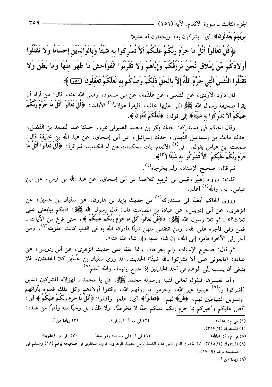 وَقَالَ الْحَاكِمُ فِي مُسْتَدْرَكِهِ: حَدَّثَنَا بَكْرُ بْنُ مُحَمَّدٍ الصَّيْرَفِيُّ بِمَرْوٍ، حَدَّثَنَا عَبْدُ الصَّمَدِ بْنُ الْفَضْلِ، حَدَّثَنَا مَالِكُ بْنُ إِسْمَاعِيلَ النَّهدي، حَدَّثَنَا إِسْرَائِيلُ، عَنْ أَبِي إِسْحَاقَ، عَنْ عَبْدِ اللَّهِ بْنِ خَلِيفَةَ قَالَ: سَمِعْتُ ابْنَ عَبَّاسٍ يَقُولُ: فِي (2) الْأَنْعَامِ آيَاتٌ مُحْكَمَاتٌ هُنَّ أُمُّ الْكِتَابِ، ثُمَّ قَرَأَ: {قُلْ تَعَالَوْا أَتْلُ مَا حَرَّمَ رَبُّكُمْ عَلَيْكُمْ [أَلا تُشْرِكُوا بِهِ شَيْئًا] } (3) .
