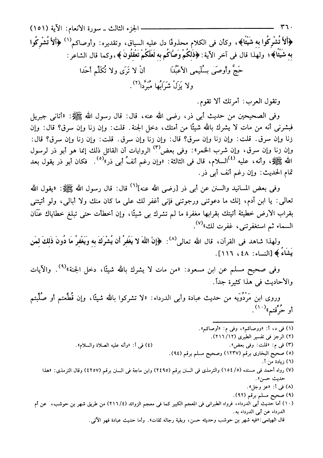 {أَلا تُشْرِكُوا بِهِ شَيْئًا} وَكَأَنَّ فِي الْكَلَامِ مَحْذُوفًا دَلَّ عَلَيْهِ السِّيَاقُ، وَتَقْدِيرُهُ: وَأَوْصَاكُمْ (1) {أَلا تُشْرِكُوا بِهِ شَيْئًا} ؛ وَلِهَذَا قَالَ فِي آخِرِ الْآيَةِ: {ذَلِكُمْ وَصَّاكُمْ بِهِ لَعَلَّكُمْ تَعْقِلُونَ} وَكَمَا قَالَ الشَّاعِرُ: