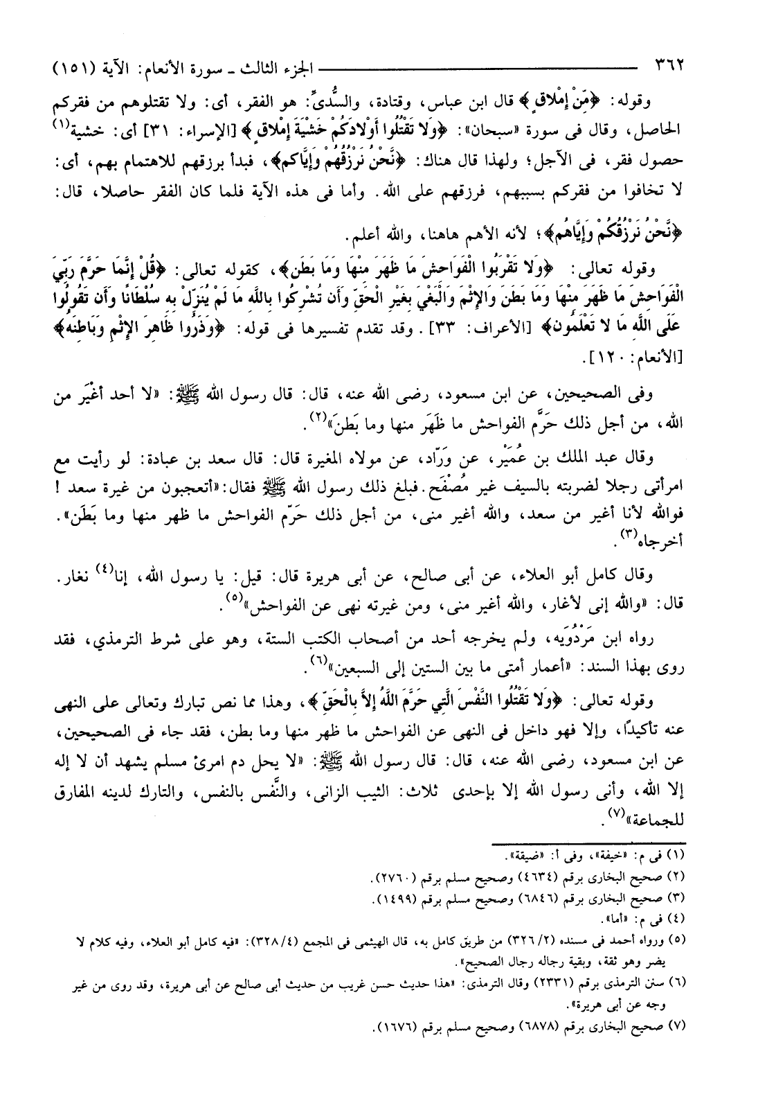 وَقَوْلُهُ تَعَالَى: {وَلا تَقْتُلُوا النَّفْسَ الَّتِي حَرَّمَ اللَّهُ إِلا بِالْحَقِّ} وَهَذَا مِمَّا نَصَّ تَبَارَكَ وَتَعَالَى عَلَى النَّهْيِ عَنْهُ تَأْكِيدًا، وَإِلَّا فَهُوَ دَاخِلٌ فِي النَّهْيِ عَنِ الْفَوَاحِشِ مَا ظَهَرَ مِنْهَا وَمَا بَطَنَ، فَقَدْ جَاءَ فِي الصَّحِيحَيْنِ، عَنِ ابْنُ مَسْعُودٍ، رَضِيَ اللَّهُ عَنْهُ، قَالَ: قَالَ رَسُولُ اللَّهِ صَلَّى اللَّهُ عَلَيْهِ وَسَلَّمَ: "لَا يَحِلُّ دَمُ امْرِئٍ مُسْلِمٍ يَشْهَدُ أَنْ لَا إِلَهَ إِلَّا اللَّهُ، وَأَنِّي رَسُولُ اللَّهِ إِلَّا بِإِحْدَى ثَلَاثٍ: الثَّيِّبِ الزَّانِي، والنفس بالنفس، والتارك لدينه المفارق للجماعة" (7) .