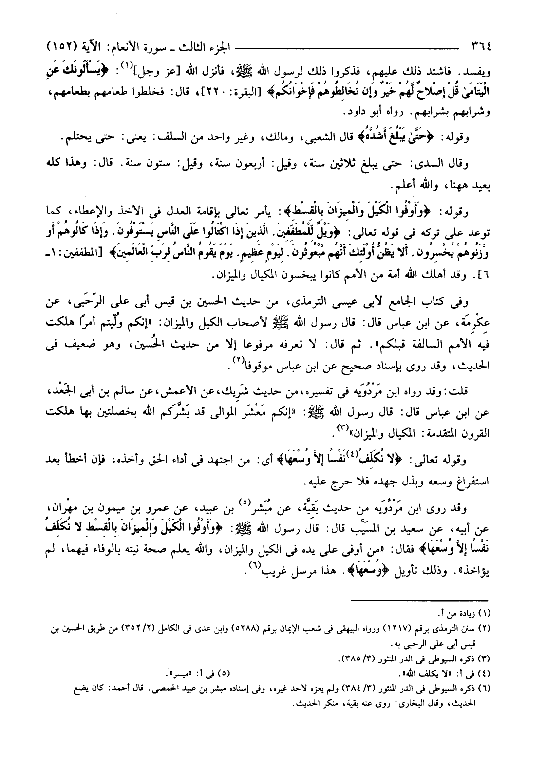 وَقَدْ رَوَى ابْنُ مَرْدُوَيه مِنْ حَدِيثِ بَقِيَّة، عَنْ مُبَشر (5) بْنِ عُبَيْدٍ، عَنْ عَمْرِو بْنِ مَيْمُونِ بْنِ مهْران، عَنْ أَبِيهِ، عَنْ سَعِيدِ بْنِ المسَيَّب قَالَ: قَالَ رَسُولُ اللَّهِ صَلَّى اللَّهُ عَلَيْهِ وَسَلَّمَ: {وَأَوْفُوا الْكَيْلَ وَالْمِيزَانَ بِالْقِسْطِ لَا نُكَلِّفُ نَفْسًا إِلا وُسْعَهَا} فَقَالَ: "مِنْ أَوْفَى عَلَى يَدِهِ فِي الْكَيْلِ وَالْمِيزَانِ، وَاللَّهُ يَعْلَمُ صِحَّةَ نِيَّتِهِ بِالْوَفَاءِ فِيهِمَا، لَمْ يُؤَاخَذْ". وَذَلِكَ تَأْوِيلُ {وُسْعَهَا} هَذَا مرسل غريب (6) .