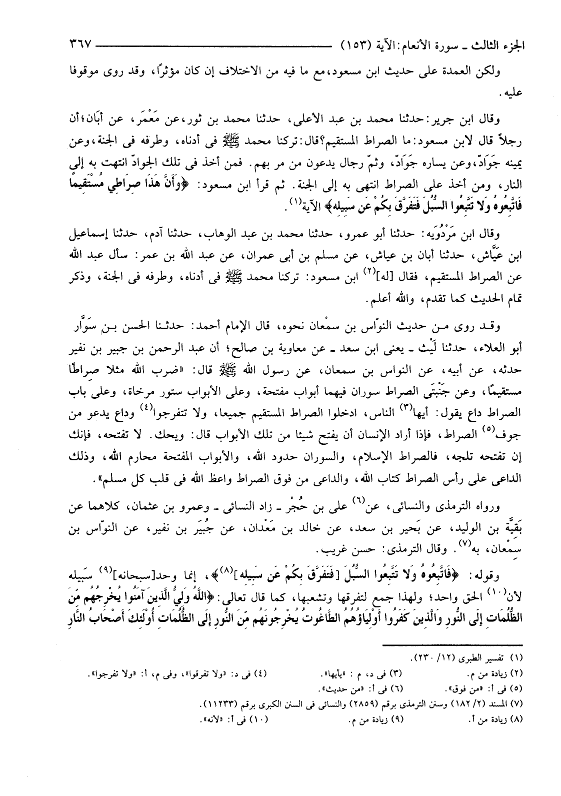 وَقَالَ ابْنُ جَرِيرٍ: حَدَّثَنَا مُحَمَّدُ بْنُ عَبْدِ الْأَعْلَى، حَدَّثَنَا مُحَمَّدُ بْنُ ثَوْرٍ، عَنْ مَعْمَر، عَنْ أبَان؛ أَنَّ رَجُلًا قَالَ لِابْنِ مَسْعُودٍ: مَا الصِّرَاطُ الْمُسْتَقِيمُ؟ قَالَ: تَرَكَنَا مُحَمَّدٌ صَلَّى اللَّهُ عَلَيْهِ وَسَلَّمَ فِي أَدْنَاهُ، وَطَرَفُهُ فِي الْجَنَّةِ، وَعَنْ يَمِينِهِ جَوَادّ، وَعَنْ يَسَارِهِ جَوَادّ، وَثَمَّ رِجَالٌ يَدْعُونَ مَنْ مَرَّ بِهِمْ. فَمَنْ أَخَذَ فِي تِلْكَ الْجَوَادِّ انْتَهَتْ بِهِ إِلَى النَّارِ، وَمِنْ أَخَذَ عَلَى الصِّرَاطِ انْتَهَى بِهِ إِلَى الْجَنَّةِ. ثُمَّ قَرَأَ ابْنُ مَسْعُودٍ: {وَأَنَّ هَذَا صِرَاطِي مُسْتَقِيمًا فَاتَّبِعُوهُ وَلا تَتَّبِعُوا السُّبُلَ فَتَفَرَّقَ بِكُمْ عَنْ سَبِيلِهِ} الْآيَةَ (1) .