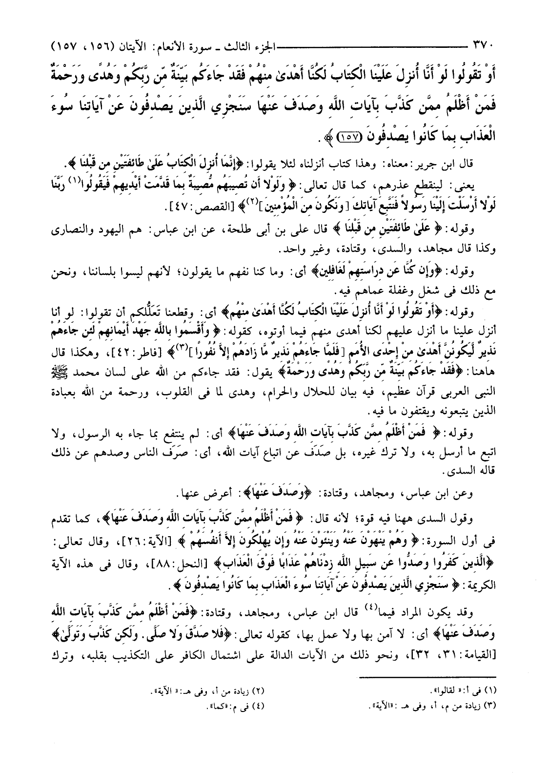 {أَنْ تَقُولُوا إِنَّمَا أُنزلَ الْكِتَابُ عَلَى طَائِفَتَيْنِ مِنْ قَبْلِنَا وَإِنْ كُنَّا عَنْ دِرَاسَتِهِمْ لَغَافِلِينَ (156) أَوْ تَقُولُوا لَوْ أَنَّا أُنزلَ عَلَيْنَا الْكِتَابُ لَكُنَّا أَهْدَى مِنْهُمْ فَقَدْ جَاءَكُمْ بَيِّنَةٌ مِنْ رَبِّكُمْ وَهُدًى وَرَحْمَةٌ فَمَنْ أَظْلَمُ مِمَّنْ كَذَّبَ بِآيَاتِ اللَّهِ وَصَدَفَ عَنْهَا سَنَجْزِي الَّذِينَ يَصْدِفُونَ عَنْ آيَاتِنَا سُوءَ الْعَذَابِ بِمَا كَانُوا يَصْدِفُونَ (157) }