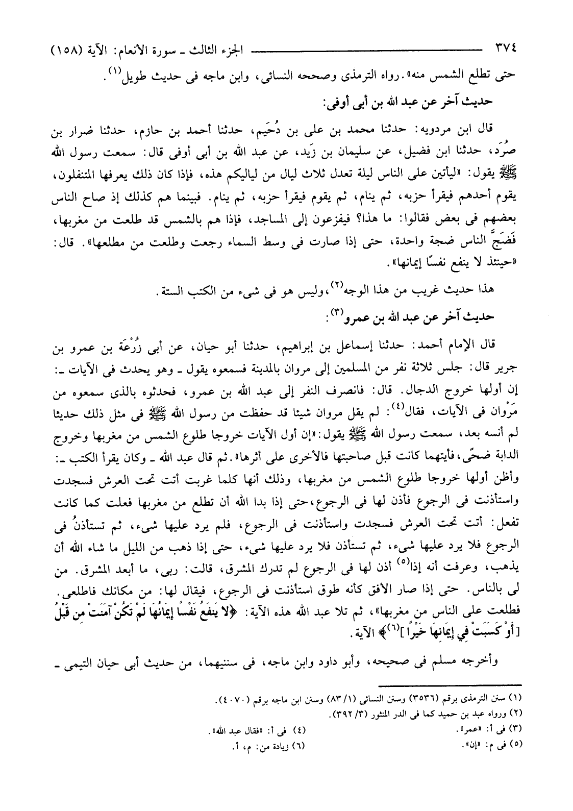 قَالَ الْإِمَامُ أَحْمَدُ: حَدَّثَنَا إِسْمَاعِيلُ بْنُ إِبْرَاهِيمَ، حَدَّثَنَا أَبُو حَيَّانَ، عَنْ أَبِي زُرْعَة بْنِ عَمْرِو بْنِ جَرِيرٍ قَالَ: جَلَسَ ثَلَاثَةُ نَفَرٍ مِنَ الْمُسْلِمِينَ إِلَى مَرْوَانَ بِالْمَدِينَةِ فَسَمِعُوهُ يَقُولُ -وَهُوَ يُحَدِّثُ فِي الْآيَاتِ -: إِنَّ أَوَّلَهَا خُرُوجُ الدَّجَّالِ. قَالَ: فَانْصَرَفَ النَّفَرُ إِلَى عَبْدِ اللَّهِ بْنِ عَمْرٍو، فَحَدَّثُوهُ بِالَّذِي سَمِعُوهُ مِنْ مَرْوَانَ فِي الْآيَاتِ، فَقَالَ (4) لَمْ يَقُلْ مَرْوان شَيْئًا قَدْ حَفِظْتُ مِنْ رَسُولِ اللَّهِ صَلَّى اللَّهُ عَلَيْهِ وَسَلَّمَ فِي مِثْلِ ذَلِكَ حَدِيثًا لَمْ أَنْسَهُ بَعْدُ، سَمِعْتُ رَسُولَ اللَّهِ صَلَّى اللَّهُ عَلَيْهِ وَسَلَّمَ يَقُولُ: "إِنْ أَوَّلَ الْآيَاتِ خُرُوجًا طُلُوعُ الشَّمْسِ مِنْ مَغْرِبِهَا وَخُرُوجُ الدَّابَّةِ ضُحًى، فَأَيَّتُهُمَا كَانَتْ قَبْلَ صَاحِبَتِهَا فَالْأُخْرَى عَلَى أَثَرِهَا". ثُمَّ قَالَ عَبْدُ اللَّهِ -وَكَانَ يَقْرَأُ الْكُتُبَ -: وَأَظُنُّ أَوَّلَهَا خُرُوجًا طُلُوعَ الشَّمْسِ مِنْ مَغْرِبِهَا، وَذَلِكَ أَنَّهَا كُلَّمَا غَرَبَتْ أَتَتْ تَحْتَ الْعَرْشِ فَسَجَدَتْ وَاسْتَأْذَنَتْ فِي الرُّجُوعِ فَأُذِنَ لَهَا فِي الرُّجُوعِ، حَتَّى إِذَا بَدَا اللَّهُ أَنْ تَطْلُعَ مِنْ مَغْرِبِهَا فَعَلَتْ كَمَا كَانَتْ تَفْعَلُ: أَتَتْ تَحْتَ الْعَرْشِ فَسَجَدَتْ وَاسْتَأْذَنَتْ فِي الرُّجُوعِ، فَلَمْ يُرَدَّ عَلَيْهَا شَيْءٌ، ثُمَّ تستأذنُ فِي الرُّجُوعِ فَلَا يُرَدُّ عَلَيْهَا شَيْءٌ، ثُمَّ تَسْتَأْذِنُ فَلَا يُرَدُّ عَلَيْهَا شَيْءٌ، حَتَّى إِذَا ذَهَبَ مِنَ اللَّيْلِ مَا شَاءَ اللَّهُ أَنْ يَذْهَبَ، وَعَرَفَتْ أَنَّهُ إِذَا (5) أَذِنَ لَهَا فِي الرُّجُوعِ لَمْ تُدْرِكِ الْمَشْرِقَ، قَالَتْ: رَبِّي، مَا أَبْعَدَ الْمَشْرِقَ. مَنْ لِي بِالنَّاسِ. حَتَّى إِذَا صَارَ الْأُفُقُ كَأَنَّهُ طَوْقٌ اسْتَأْذَنَتْ فِي الرُّجُوعِ، فَيُقَالُ لَهَا: مِنْ مَكَانِكِ فَاطْلَعِي. فَطَلَعَتْ عَلَى النَّاسِ مِنْ مَغْرِبِهَا"، ثُمَّ تَلَا عَبْدُ اللَّهِ هَذِهِ الْآيَةَ: {لَا يَنْفَعُ نَفْسًا إِيمَانُهَا لَمْ تَكُنْ آمَنَتْ مِنْ قَبْلُ [أَوْ كَسَبَتْ فِي إِيمَانِهَا خَيْرًا] } (6) الْآيَةَ.