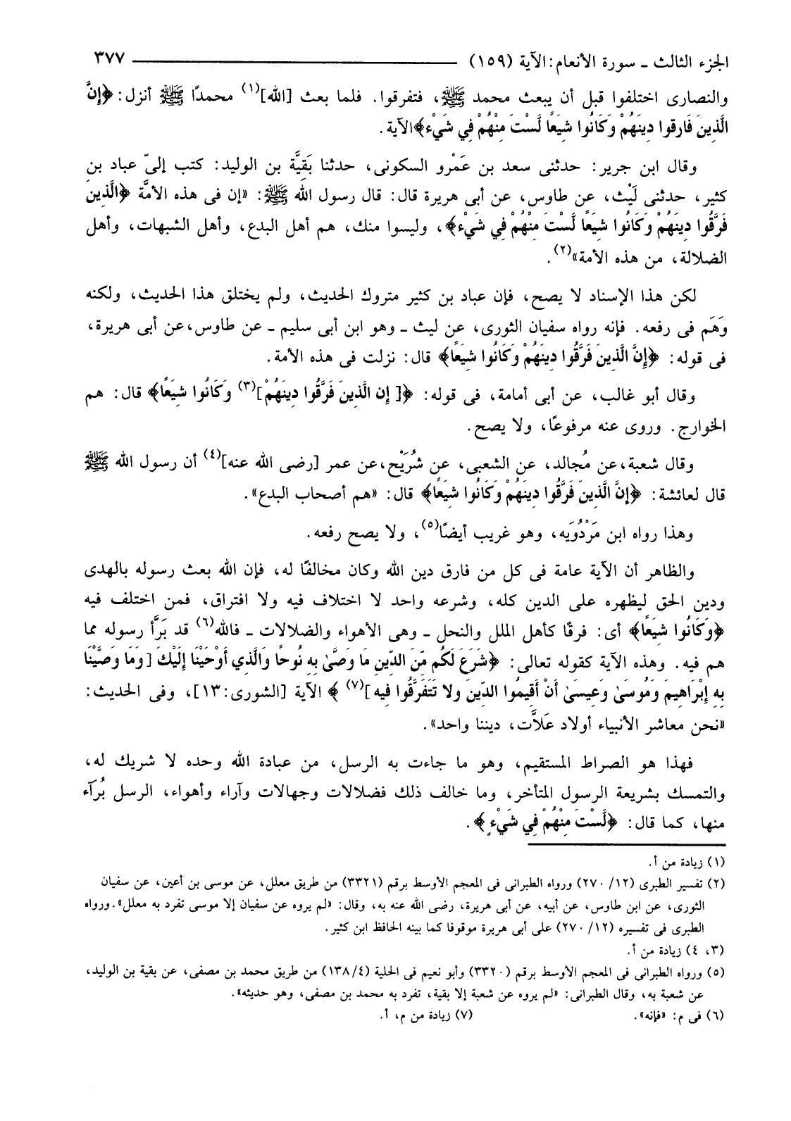 وَقَالَ ابْنُ جَرِيرٍ: حَدَّثَنِي سَعْدُ بْنُ عَمْرو السَّكُونِيُّ، حَدَّثَنَا بَقِيَّة بْنُ الْوَلِيدِ: كَتَبَ إِلَيَّ عَبَّادُ بْنُ كَثِيرٍ، حَدَّثَنِي لَيْث، عَنْ طَاوُسٍ، عَنْ أَبِي هُرَيْرَةَ قَالَ: قَالَ رَسُولُ اللَّهِ صَلَّى اللَّهُ عَلَيْهِ وَسَلَّمَ: "إِنَّ فِي هَذِهِ الأمَّة {الَّذِينَ فَرَّقُوا دِينَهُمْ وَكَانُوا شِيَعًا لَسْتَ مِنْهُمْ فِي شَيْءٍ} وَلَيْسُوا مِنْكَ، هُمْ أَهْلُ الْبِدَعِ، وَأَهْلُ الشُّبَهَاتِ، وَأَهْلُ الضَّلَالَةِ، مِنْ هَذِهِ الْأُمَّةِ" (2) .