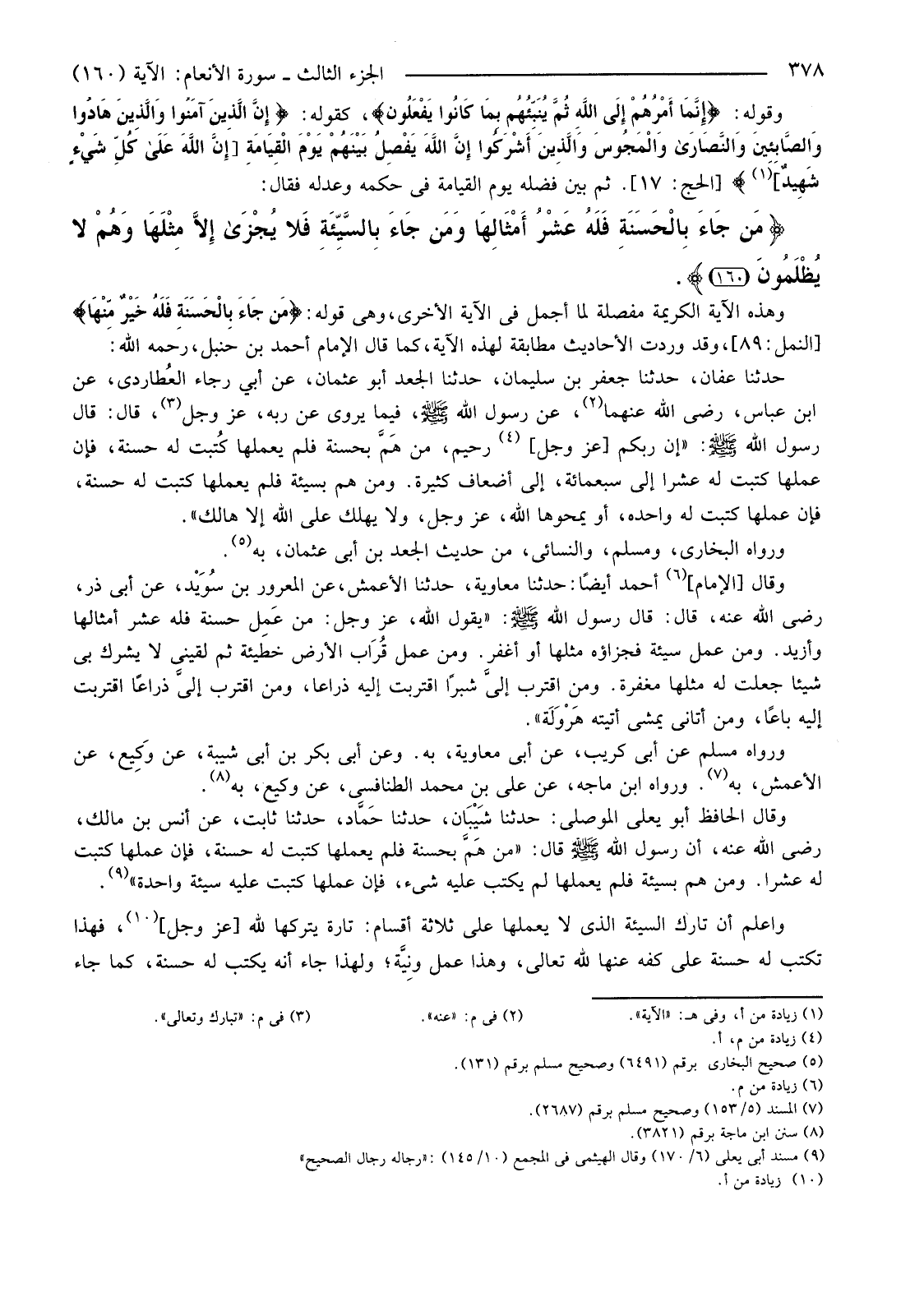 وَهَذِهِ الْآيَةُ الْكَرِيمَةُ مُفَصِّلَةٌ لِمَا أَجْمَلَ فِي الْآيَةِ الْأُخْرَى، وَهِيَ قَوْلُهُ: {مَنْ جَاءَ بِالْحَسَنَةِ فَلَهُ خَيْرٌ مِنْهَا} [النَّمْلِ: 89] ، وَقَدْ وَرَدَتِ الْأَحَادِيثُ مُطَابِقَةً لِهَذِهِ الْآيَةِ، كَمَا قَالَ الْإِمَامُ أَحْمَدُ بْنُ حَنْبَلٍ، رَحِمَهُ اللَّهُ: