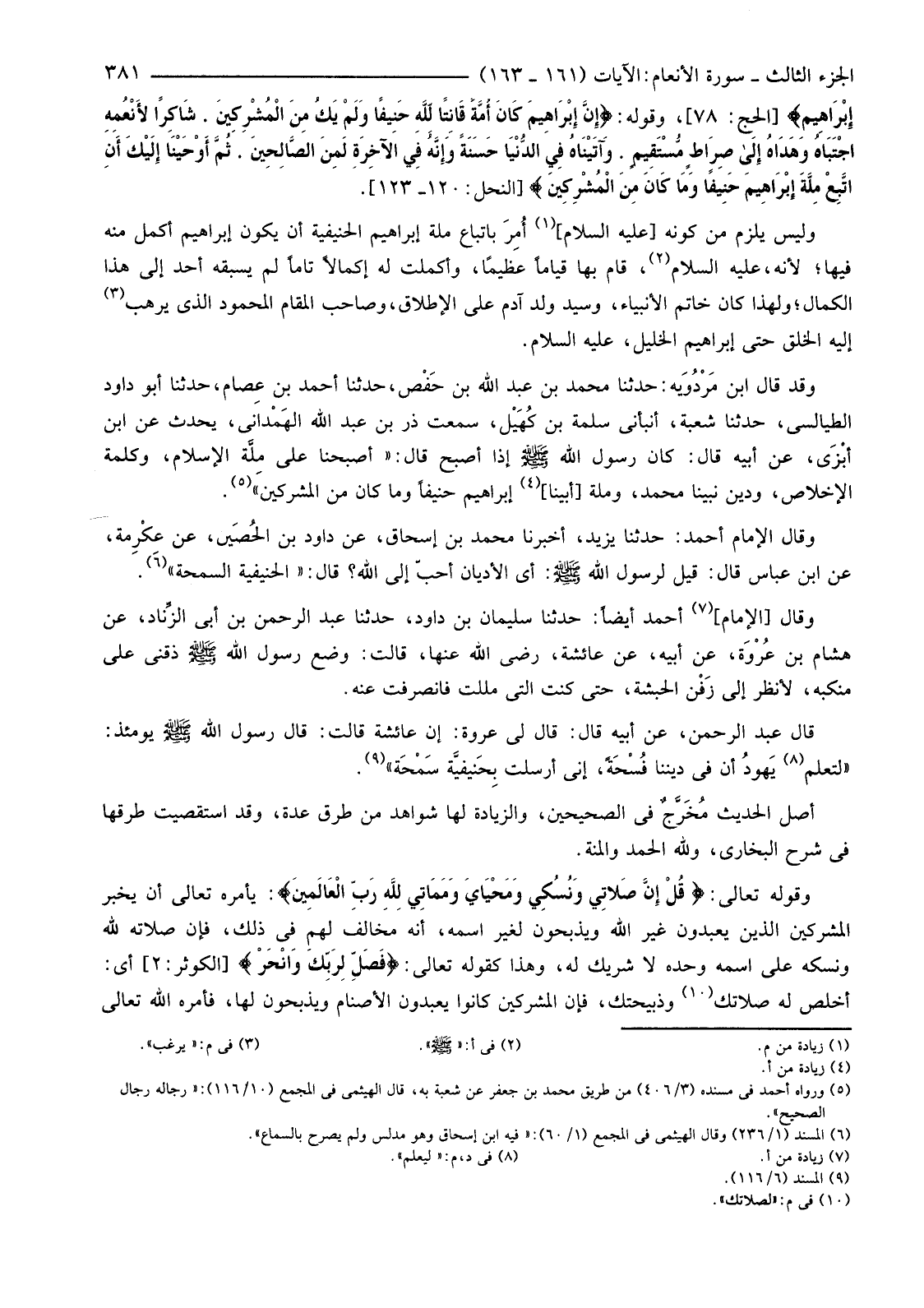 وَلَيْسَ يَلْزَمُ مِنْ كَوْنِهِ [عَلَيْهِ السَّلَامُ] (1) أُمِرَ بِاتِّبَاعِ مِلَّةِ إِبْرَاهِيمَ الْحَنِيفِيَّةِ أَنْ يَكُونَ إِبْرَاهِيمُ أَكْمَلَ مِنْهُ فِيهَا؛ لِأَنَّهُ، عَلَيْهِ السَّلَامُ (2) قَامَ بِهَا قِيَامًا عَظِيمًا، وَأُكْمِلَتْ لَهُ إِكْمَالًا تَامًّا لَمْ يَسْبِقْهُ أَحَدٌ إِلَى هَذَا الْكَمَالِ؛ وَلِهَذَا كَانَ خَاتَمَ الْأَنْبِيَاءِ، وَسَيِّدَ وَلَدِ آدَمَ عَلَى الْإِطْلَاقِ، وَصَاحِبَ الْمَقَامِ الْمَحْمُودِ الَّذِي يَرْهَبُ (3) إِلَيْهِ الْخَلْقُ حَتَّى إِبْرَاهِيمُ الْخَلِيلُ، عَلَيْهِ السَّلَامُ.