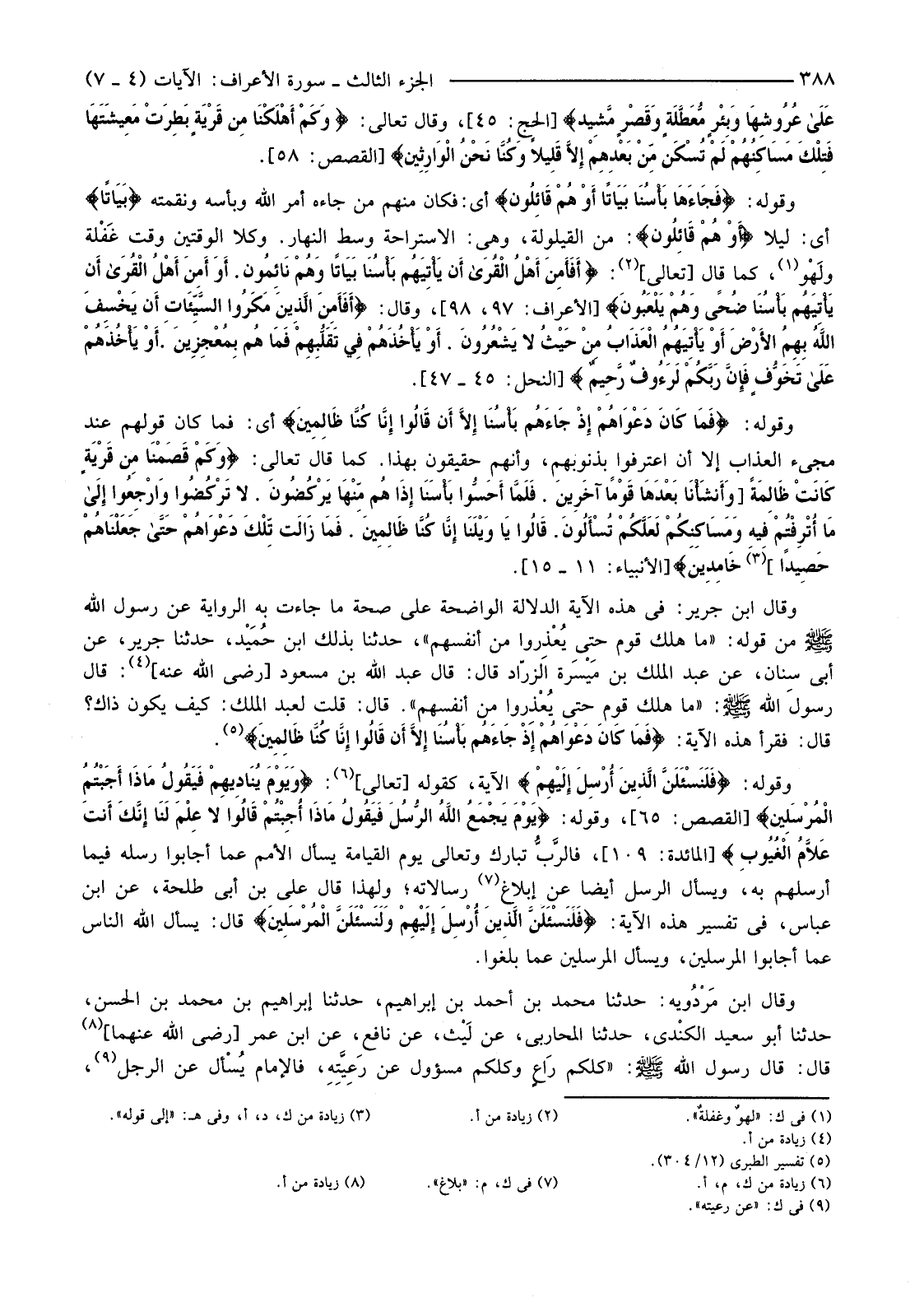 وَقَوْلُهُ: {فَلَنَسْأَلَنَّ الَّذِينَ أُرْسِلَ إِلَيْهِمْ} الْآيَةَ، كَقَوْلِهِ [تَعَالَى] (6) {وَيَوْمَ يُنَادِيهِمْ فَيَقُولُ مَاذَا أَجَبْتُمُ الْمُرْسَلِينَ} [الْقَصَصِ: 65] وَقَوْلِهِ: {يَوْمَ يَجْمَعُ اللَّهُ الرُّسُلَ فَيَقُولُ مَاذَا أُجِبْتُمْ قَالُوا لَا عِلْمَ لَنَا إِنَّكَ أَنْتَ عَلامُ الْغُيُوبِ} [الْمَائِدَةِ: 109] فالرَّبُّ تَبَارَكَ وَتَعَالَى يَوْمَ الْقِيَامَةِ يَسْأَلُ الْأُمَمَ عَمَّا أَجَابُوا رُسُلَهُ فِيمَا أَرْسَلَهُمْ بِهِ، وَيَسْأَلُ الرُّسُلَ أَيْضًا عَنْ إِبْلَاغِ (7) رِسَالَاتِهِ؛ وَلِهَذَا قَالَ عَلِيُّ بْنُ أَبِي طَلْحَةَ، عَنِ ابْنِ عَبَّاسٍ، فِي تَفْسِيرِ هَذِهِ الْآيَةِ: {فَلَنَسْأَلَنَّ الَّذِينَ أُرْسِلَ إِلَيْهِمْ وَلَنَسْأَلَنَّ الْمُرْسَلِينَ} قَالَ: يَسْأَلُ اللَّهُ النَّاسَ عَمَّا أَجَابُوا الْمُرْسَلِينَ، وَيَسْأَلُ الْمُرْسَلِينَ عَمَّا بَلَّغُوا.