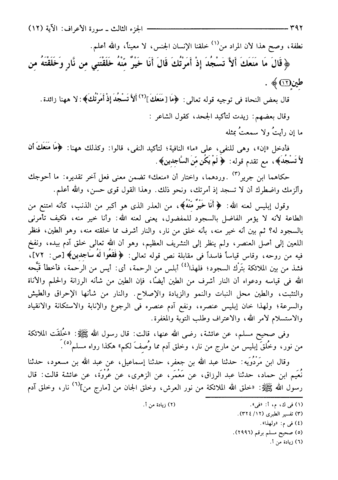 وَفِي صَحِيحِ مُسْلِمٍ، عَنْ عَائِشَةَ، رَضِيَ اللَّهُ عَنْهَا، قَالَتْ: قَالَ رَسُولُ اللَّهِ صَلَّى اللَّهُ عَلَيْهِ وَسَلَّمَ: "خُلِقَت الْمَلَائِكَةُ مِنْ نُورٍ، وخُلقَ إِبْلِيسُ مِنْ مَارِجٍ مِنْ نَارٍ، وَخُلِقَ آدَمُ مِمَّا وُصِفَ لَكُمْ" هَكَذَا رَوَاهُ مُسْلِمٌ (4) .