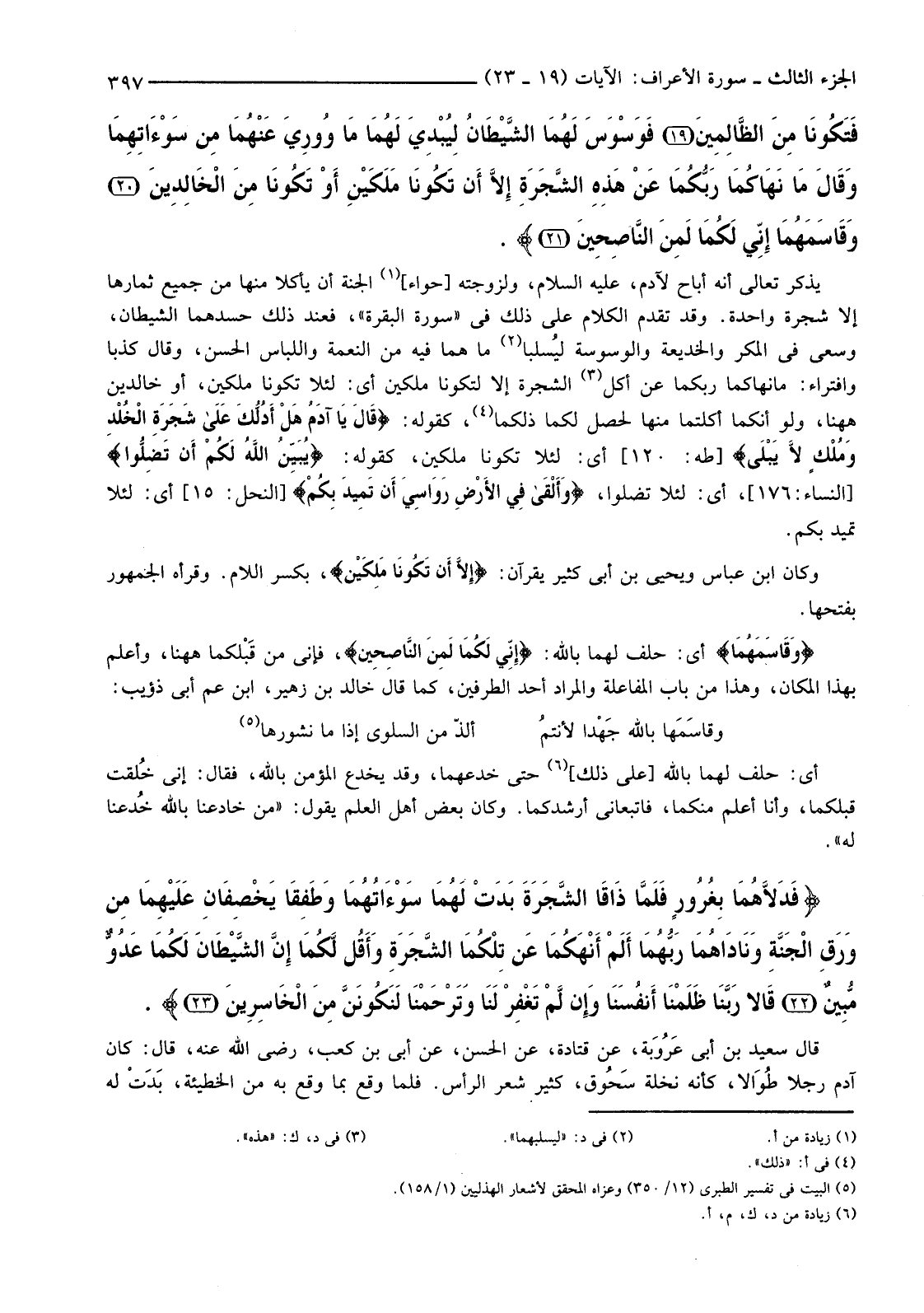 يَذْكُرُ تَعَالَى أَنَّهُ أَبَاحَ لِآدَمَ، عَلَيْهِ السَّلَامُ، وَلِزَوْجَتِهِ [حَوَّاءَ] (1) الْجَنَّةَ أَنْ يَأْكُلَا مِنْهَا مِنْ جَمِيعِ ثِمَارِهَا إِلَّا شَجَرَةً وَاحِدَةً. وَقَدْ تَقَدَّمَ الْكَلَامُ عَلَى ذَلِكَ فِي "سُورَةِ الْبَقَرَةِ"، فَعِنْدَ ذَلِكَ حَسَدَهُمَا الشَّيْطَانُ، وَسَعَى فِي الْمَكْرِ وَالْخَدِيعَةِ وَالْوَسْوَسَةِ ليُسلبا (2) مَا هُمَا فِيهِ مِنَ النِّعْمَةِ وَاللِّبَاسِ الْحَسَنِ، وَقَالَ كَذِبًا وَافْتِرَاءً: مَا نَهَاكُمَا رَبُّكُمَا عَنْ أَكْلِ (3) الشَّجَرَةِ إِلَّا لِتَكُونَا مَلَكَيْنِ أَيْ: لِئَلَّا تَكُونَا مَلَكَيْنِ، أَوْ خَالِدَيْنِ هَاهُنَا وَلَوْ أَنَّكُمَا أَكَلْتُمَا مِنْهَا لَحَصَلَ لَكُمَا ذَلِكُمَا (4) كَقَوْلِهِ: {قَالَ يَا آدَمُ هَلْ أَدُلُّكَ عَلَى شَجَرَةِ الْخُلْدِ وَمُلْكٍ لَا يَبْلَى} [طه: 120] أَيْ: لِئَلَّا تَكُونَا مَلَكَيْنِ، كَقَوْلِهِ: {يُبَيِّنُ اللَّهُ لَكُمْ أَنْ تَضِلُّوا} [النِّسَاءِ: 176] أَيْ: لِئَلَّا تَضِلُّوا، {وَأَلْقَى فِي الأرْضِ رَوَاسِيَ أَنْ تَمِيدَ بِكُمْ} [النَّحْلِ: 15] أَيْ: لِئَلَّا تَمِيدَ بِكُمْ.