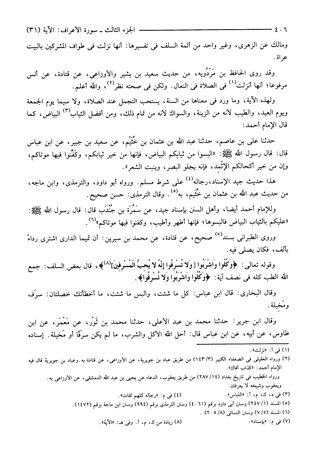 وَلِهَذِهِ الْآيَةِ، وَمَا وَرَدَ فِي مَعْنَاهَا مِنَ السُّنَّةِ، يُسْتَحَبُّ التَّجَمُّلُ عِنْدَ الصَّلَاةِ، وَلَا سِيَّمَا يَوْمَ الْجُمُعَةِ وَيَوْمَ الْعِيدِ، وَالطِّيبُ لِأَنَّهُ مِنَ الزِّينَةِ، وَالسِّوَاكُ لِأَنَّهُ مِنْ تَمَامِ ذَلِكَ، وَمِنْ أَفْضَلِ الثِّيَابِ (3) الْبَيَاضُ، كَمَا قَالَ الْإِمَامُ أَحْمَدُ:
