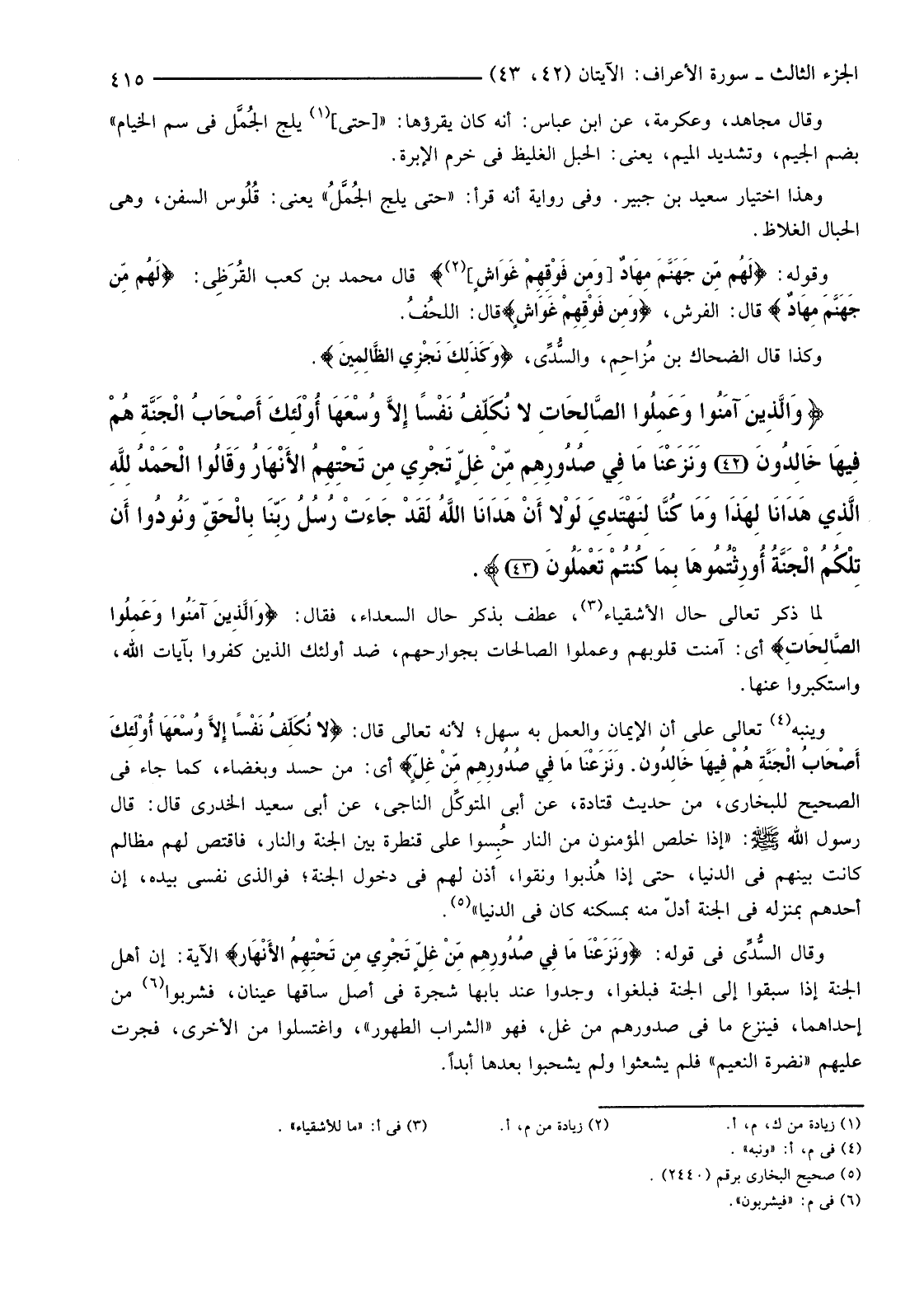 وَيُنَبِّهُ (4) تَعَالَى عَلَى أَنَّ الْإِيمَانَ وَالْعَمَلَ بِهِ سَهْلٌ؛ لِأَنَّهُ تَعَالَى قَالَ: {لَا نُكَلِّفُ نَفْسًا إِلا وُسْعَهَا أُولَئِكَ أَصْحَابُ الْجَنَّةِ هُمْ فِيهَا خَالِدُونَ. وَنزعْنَا مَا فِي صُدُورِهِمْ مِنْ غِلٍّ} أَيْ: مِنْ حَسَدٍ وَبَغْضَاءَ، كَمَا جَاءَ فِي الصَّحِيحِ لِلْبُخَارِيِّ، مِنْ حَدِيثِ قَتَادَةَ، عَنْ أَبِي المتوكِّل النَّاجِي، عَنْ أَبِي سَعِيدٍ الْخُدْرِيِّ قَالَ: قَالَ رَسُولُ اللَّهِ صَلَّى اللَّهُ عَلَيْهِ وَسَلَّمَ: "إِذَا خَلَصَ الْمُؤْمِنُونَ مِنَ النَّارِ حُبِسوا عَلَى قَنْطَرَةٍ بَيْنَ الْجَنَّةِ وَالنَّارِ، فَاقْتَصَّ لَهُمْ مَظَالِمُ كَانَتْ بَيْنَهُمْ فِي الدُّنْيَا، حَتَّى إِذَا هُذبوا وَنُقُّوا، أُذِنَ لَهُمْ فِي دُخُولِ الْجَنَّةِ؛ فَوَالَّذِي نَفْسِي بِيَدِهِ، إِنَّ أَحَدَهُمْ بِمَنْزِلِهِ فِي الْجَنَّةِ أَدُلُّ مِنْهُ بِمَسْكَنِهِ كَانَ فِي الدُّنْيَا" (5)