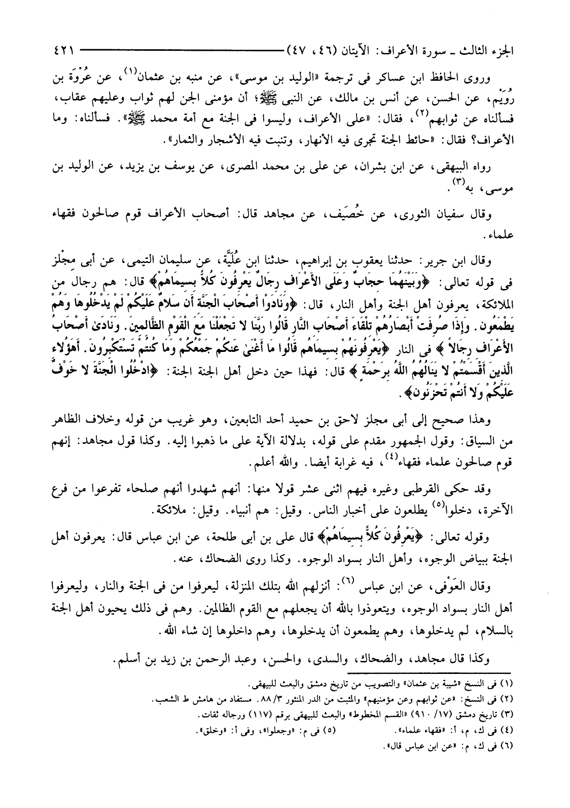 وَقَالَ سُفْيَانُ الثَّوْرِيُّ، عَنْ خُصَيف، عَنْ مُجَاهِدٍ قَالَ: أَصْحَابُ الْأَعْرَافِ قَوْمٌ صَالِحُونَ فُقَهَاءُ عُلَمَاءُ.