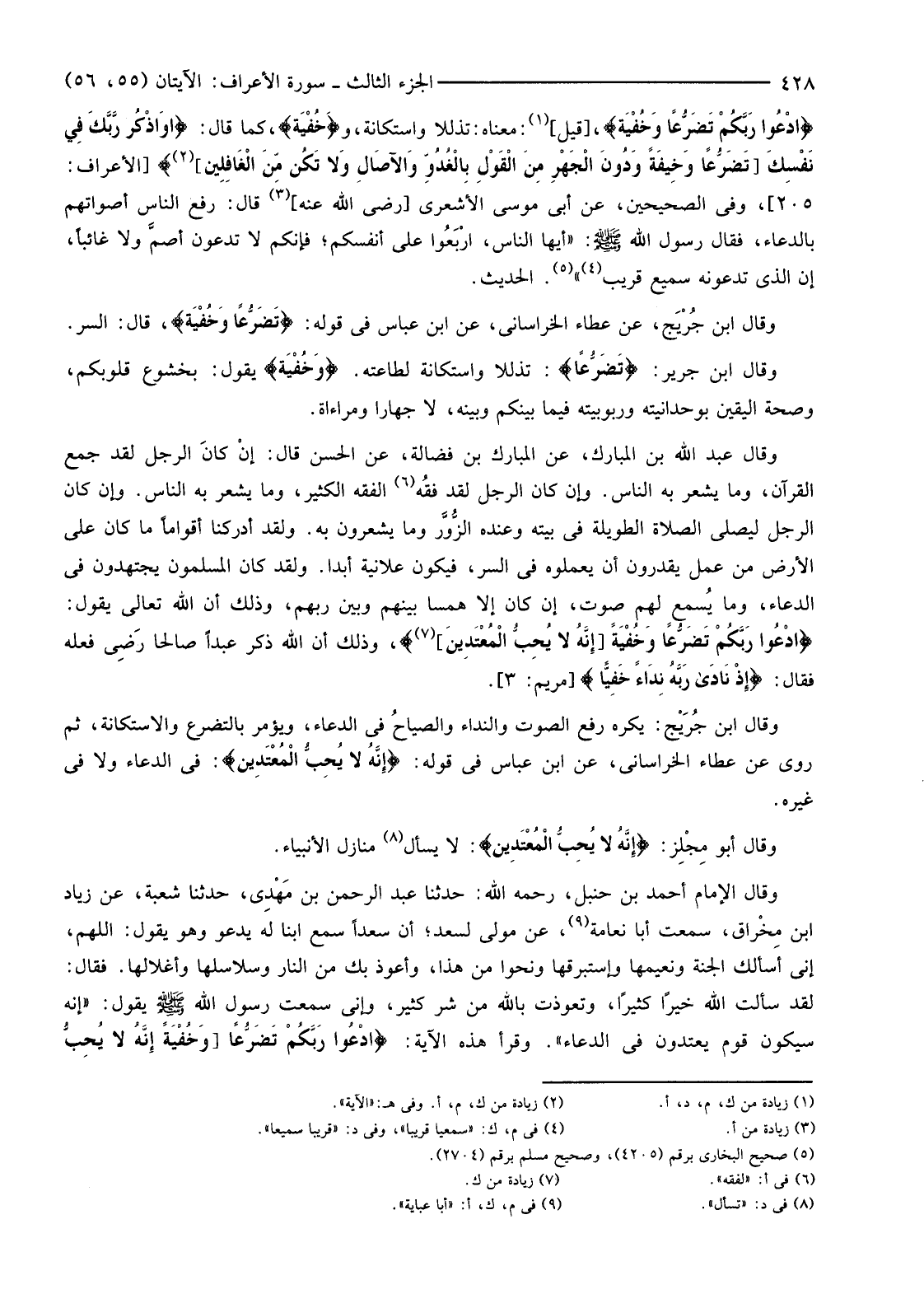 {ادْعُوا رَبَّكُمْ تَضَرُّعًا وَخُفْيَةً} [قِيلَ] (1) مَعْنَاهُ: تَذَلُّلًا وَاسْتِكَانَةً، وَ {خُفْيَة} كَمَا قَالَ: {وَاذْكُرْ رَبَّكَ فِي نَفْسِكَ [تَضَرُّعًا وَخِيفَةً وَدُونَ الْجَهْرِ مِنَ الْقَوْلِ بِالْغُدُوِّ وَالآصَالِ وَلا تَكُنْ مِنَ الْغَافِلِينَ (2) ] } [الْأَعْرَافِ:205] وَفِي الصَّحِيحَيْنِ، عَنْ أَبِي مُوسَى الْأَشْعَرِيِّ [رَضِيَ اللَّهُ عَنْهُ] (3) قَالَ: رَفَعَ النَّاسُ أَصْوَاتَهُمْ بِالدُّعَاءِ، فَقَالَ رَسُولُ اللَّهِ صَلَّى اللَّهُ عَلَيْهِ وَسَلَّمَ: "أَيُّهَا النَّاسُ، ارْبَعُوا عَلَى أَنْفُسِكُمْ؛ فَإِنَّكُمْ لَا تَدْعُونَ أصمَّ وَلَا غَائِبًا، إِنَّ الَّذِي تَدْعُونَهُ سَمِيعٌ قَرِيبٌ (4) (5) الْحَدِيثَ.