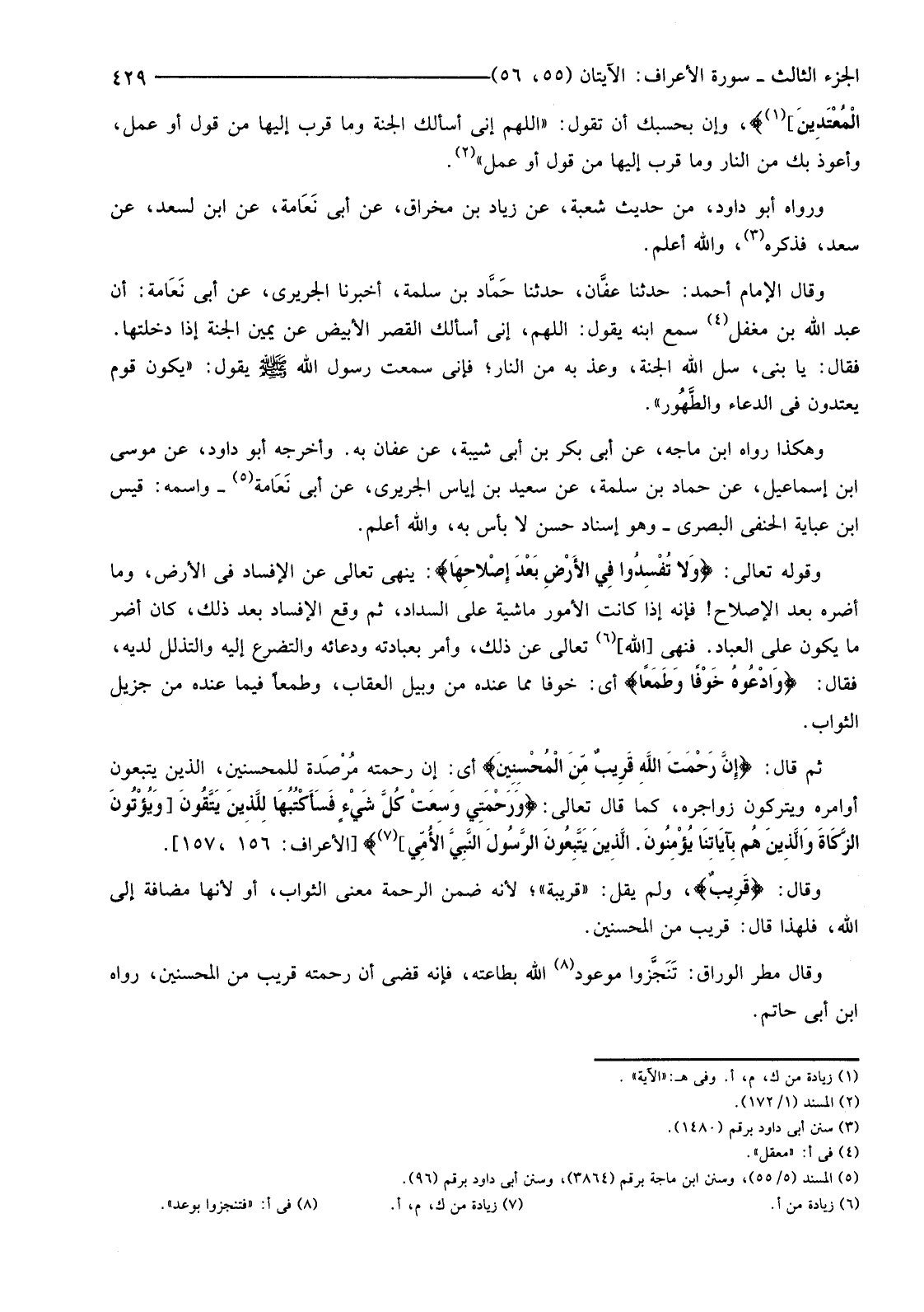 ثُمَّ قَالَ: {إِنَّ رَحْمَةَ اللَّهِ قَرِيبٌ مِنَ الْمُحْسِنِينَ} أَيْ: إِنَّ رَحْمَتَهُ مُرْصَدة لِلْمُحْسِنِينَ، الَّذِينَ يَتَّبِعُونَ أَوَامِرَهُ وَيَتْرُكُونَ زَوَاجِرَهُ، كَمَا قَالَ تَعَالَى: {وَرَحْمَتِي وَسِعَتْ كُلَّ شَيْءٍ فَسَأَكْتُبُهَا لِلَّذِينَ يَتَّقُونَ. [وَيُؤْتُونَ الزَّكَاةَ وَالَّذِينَ هُمْ بِآيَاتِنَا يُؤْمِنُونَ. الَّذِينَ يَتَّبِعُونَ الرَّسُولَ النَّبِيَّ الأمِّيَّ] } (6) [الْأَعْرَافِ: 156، 157] .