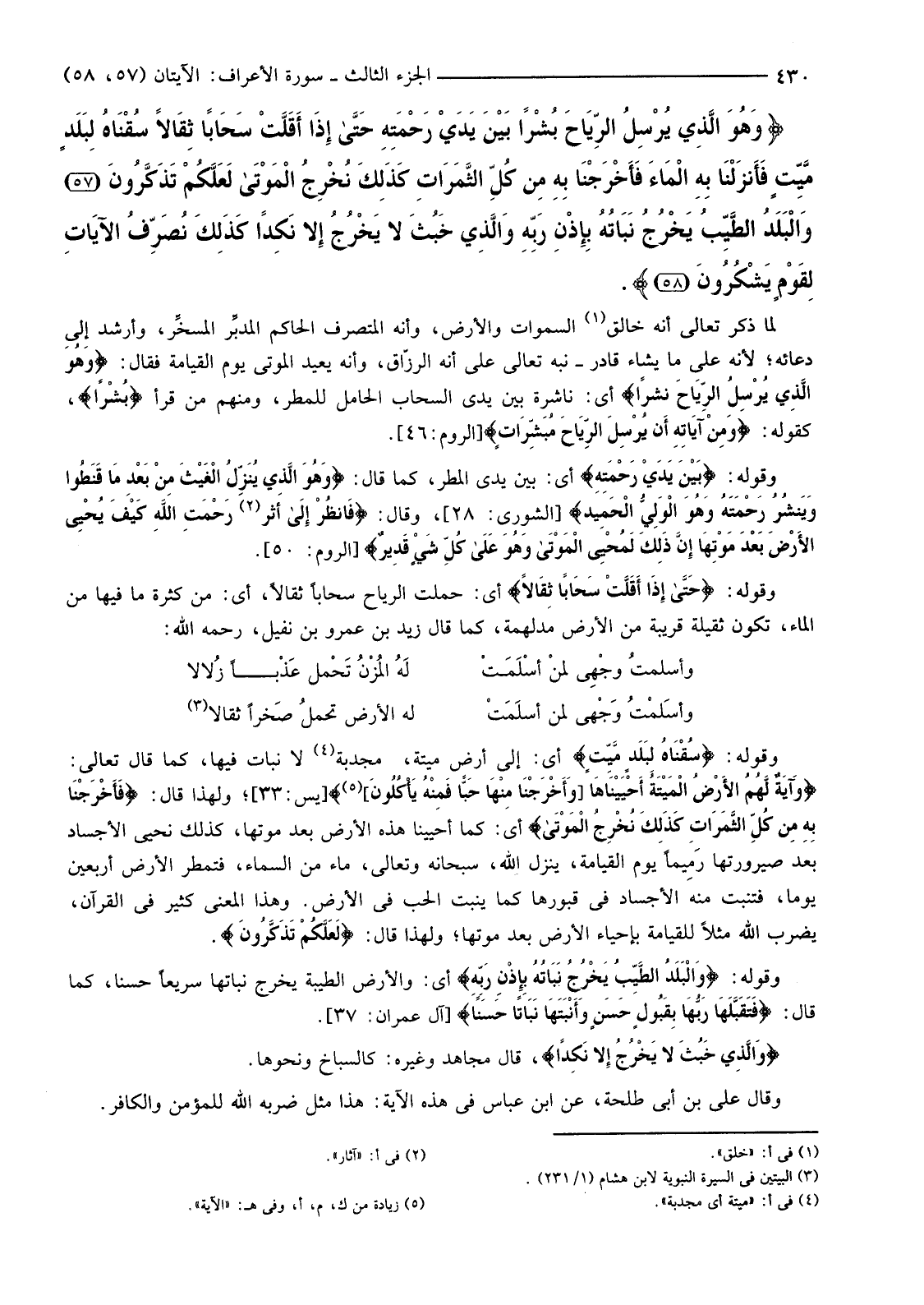 لَمَّا ذَكَرَ تَعَالَى أَنَّهُ خالق (1) السموات وَالْأَرْضِ، وَأَنَّهُ الْمُتَصَرِّفُ الْحَاكِمُ المدبِّر المسخِّر، وَأَرْشَدَ إِلَى دُعَائِهِ؛ لِأَنَّهُ عَلَى مَا يَشَاءُ قَادِرٌ -نَبَّهَ تَعَالَى عَلَى أَنَّهُ الرَّزَّاقُ، وَأَنَّهُ يُعِيدُ الْمَوْتَى يَوْمَ الْقِيَامَةِ فَقَالَ: " وَهُوَ الَّذِي يُرْسِلُ الرِّيَاحَ نشْرًا " أَيْ: نَاشِرَةً بَيْنَ يَدَيِ السَّحَابِ الْحَامِلِ لِلْمَطَرِ، وَمِنْهُمْ مَنْ قَرَأَ {بُشْرًا} كَقَوْلِهِ {وَمِنْ آيَاتِهِ أَنْ يُرْسِلَ الرِّيَاحَ مُبَشِّرَاتٍ} [الرُّومِ:46]