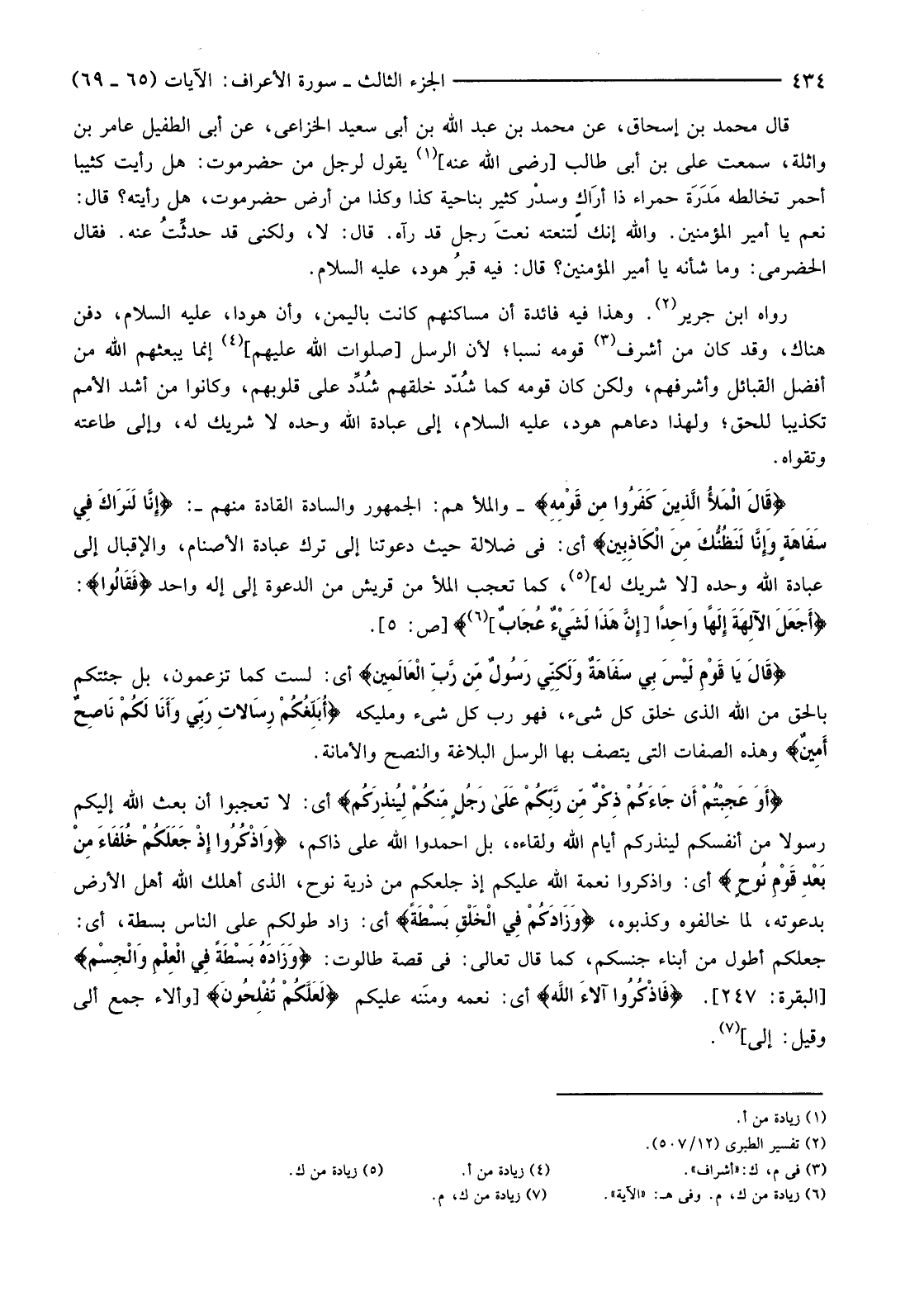رَوَاهُ ابْنُ جَرِيرٍ (2) وَهَذَا فِيهِ فَائِدَةٌ أَنَّ مَسَاكِنَهُمْ كَانَتْ بِالْيَمَنِ، وَأَنَّ هُودًا، عَلَيْهِ السَّلَامُ، دُفِنَ هُنَاكَ، وَقَدْ كَانَ مِنْ أَشْرَفِ (3) قَوْمِهِ نَسَبًا؛ لِأَنَّ الرُّسُلَ [صَلَوَاتُ اللَّهِ عَلَيْهِمْ] (4) إِنَّمَا يَبْعَثُهُمُ اللَّهُ مِنْ أَفْضَلِ الْقَبَائِلِ وَأَشْرَفِهِمْ، وَلَكِنْ كَانَ قَوْمُهُ كَمَا شُدّد خَلْقُهُمْ شُدِّد عَلَى قُلُوبِهِمْ، وَكَانُوا مِنْ أَشَدِّ الْأُمَمِ تَكْذِيبًا لِلْحَقِّ؛ وَلِهَذَا دَعَاهُمْ هُودٌ، عَلَيْهِ السَّلَامُ، إِلَى عِبَادَةِ اللَّهِ وَحْدَهُ لَا شَرِيكَ لَهُ، وَإِلَى طَاعَتِهِ وَتَقْوَاهُ.