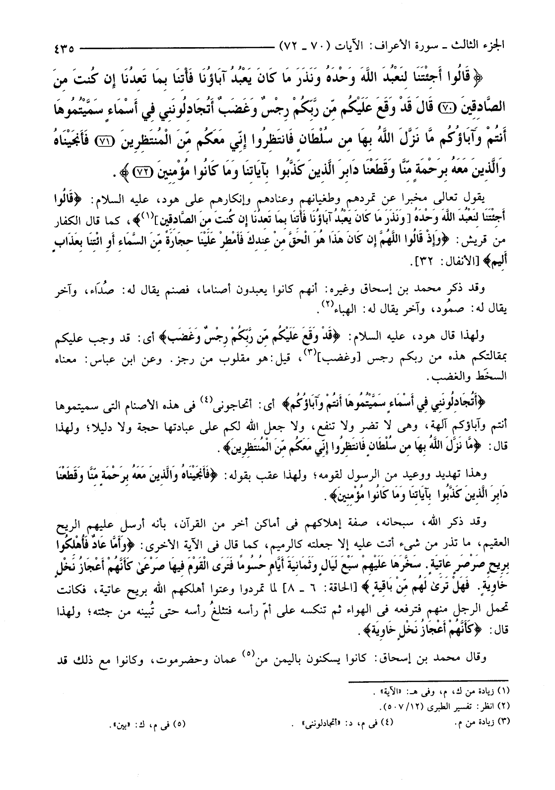 {قَالُوا أَجِئْتَنَا لِنَعْبُدَ اللَّهَ وَحْدَهُ وَنَذَرَ مَا كَانَ يَعْبُدُ آبَاؤُنَا فَأْتِنَا بِمَا تَعِدُنَا إِنْ كُنْتَ مِنَ الصَّادِقِينَ (70) قَالَ قَدْ وَقَعَ عَلَيْكُمْ مِنْ رَبِّكُمْ رِجْسٌ وَغَضَبٌ أَتُجَادِلُونَنِي فِي أَسْمَاءٍ سَمَّيْتُمُوهَا أَنْتُمْ وَآبَاؤُكُمْ مَا نزلَ اللَّهُ بِهَا مِنْ سُلْطَانٍ فَانْتَظِرُوا إِنِّي مَعَكُمْ مِنَ الْمُنْتَظِرِينَ (71) فَأَنْجَيْنَاهُ وَالَّذِينَ مَعَهُ بِرَحْمَةٍ مِنَّا وَقَطَعْنَا دَابِرَ الَّذِينَ كَذَّبُوا بِآيَاتِنَا وَمَا كَانُوا مُؤْمِنِينَ (72) }
