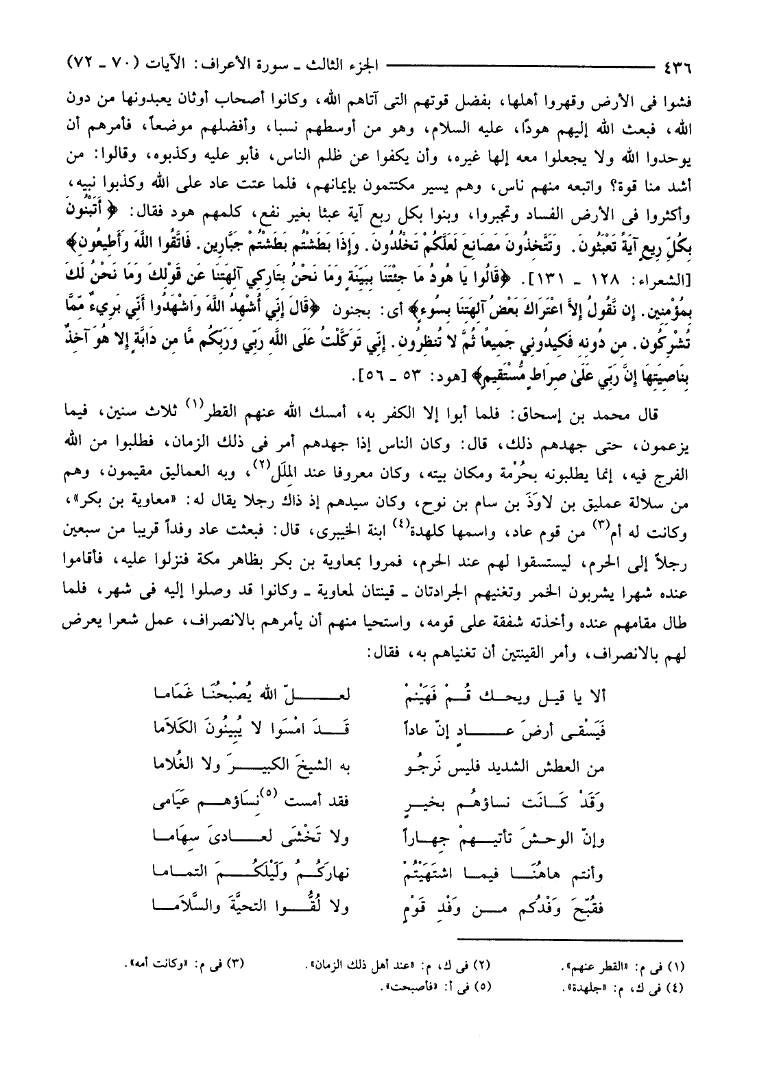 قَالَ مُحَمَّدُ بْنُ إِسْحَاقَ: فَلَمَّا أَبَوْا إِلَّا الْكُفْرَ بِهِ، أَمْسَكَ اللَّهُ عَنْهُمُ الْقَطْرَ (1) ثَلَاثَ سِنِينَ، فِيمَا يَزْعُمُونَ، حَتَّى جَهَدَهُمْ ذَلِكَ، قَالَ: وَكَانَ النَّاسُ إِذَا جَهَدَهُمْ أَمْرٌ فِي ذَلِكَ الزَّمَانِ، فَطَلَبُوا مِنَ اللَّهِ الْفَرَجَ فِيهِ، إِنَّمَا يَطْلُبُونَهُ بحُرْمة وَمَكَانِ بَيْتِهِ، وَكَانَ مَعْرُوفًا عِنْدَ المِلَل (2) وَبِهِ الْعَمَالِيقُ مُقِيمُونَ، وَهُمْ مِنْ سُلَالَةِ عِمْلِيقَ بْنِ لاوَذَ بْنِ سَامَ بْنِ نُوحٍ، وَكَانَ سَيِّدُهُمْ إِذْ ذَاكَ رَجُلًا يُقَالُ لَهُ: "مُعَاوِيَةُ بْنُ بَكْرٍ"، وَكَانَتْ لَهُ أُمٌّ (3) مِنْ قَوْمِ عَادٍ، وَاسْمُهَا كَلْهَدَةُ (4) ابْنَةُ الْخَيْبَرِيِّ، قَالَ: فَبَعَثَتْ عَادٌ وَفْدًا قَرِيبًا مِنْ سَبْعِينَ رَجُلًا إِلَى الْحَرَمِ، لِيَسْتَسْقُوا لَهُمْ عِنْدَ الْحَرَمِ، فَمَرُّوا بِمُعَاوِيَةَ بْنِ بَكْرٍ بِظَاهِرِ مَكَّةَ فَنَزَلُوا عَلَيْهِ، فَأَقَامُوا عِنْدَهُ شَهْرًا يَشْرَبُونَ الْخَمْرَ وَتُغَنِّيهُمُ الْجَرَادَتَانِ -قَيْنَتَانِ لِمُعَاوِيَةَ -وَكَانُوا قَدْ وَصَلُوا إِلَيْهِ فِي شَهْرٍ، فَلَمَّا طَالَ مُقَامُهُمْ عِنْدَهُ وَأَخَذَتْهُ شَفَقَةٌ عَلَى قَوْمِهِ، وَاسْتَحْيَا مِنْهُمْ أَنْ يَأْمُرَهُمْ بِالِانْصِرَافِ، عَمِلَ شِعْرًا يَعْرِضُ لَهُمْ بِالِانْصِرَافِ، وَأَمَرَ الْقَيْنَتَيْنِ أَنْ تُغَنِّيَاهُمْ بِهِ، فَقَالَ: