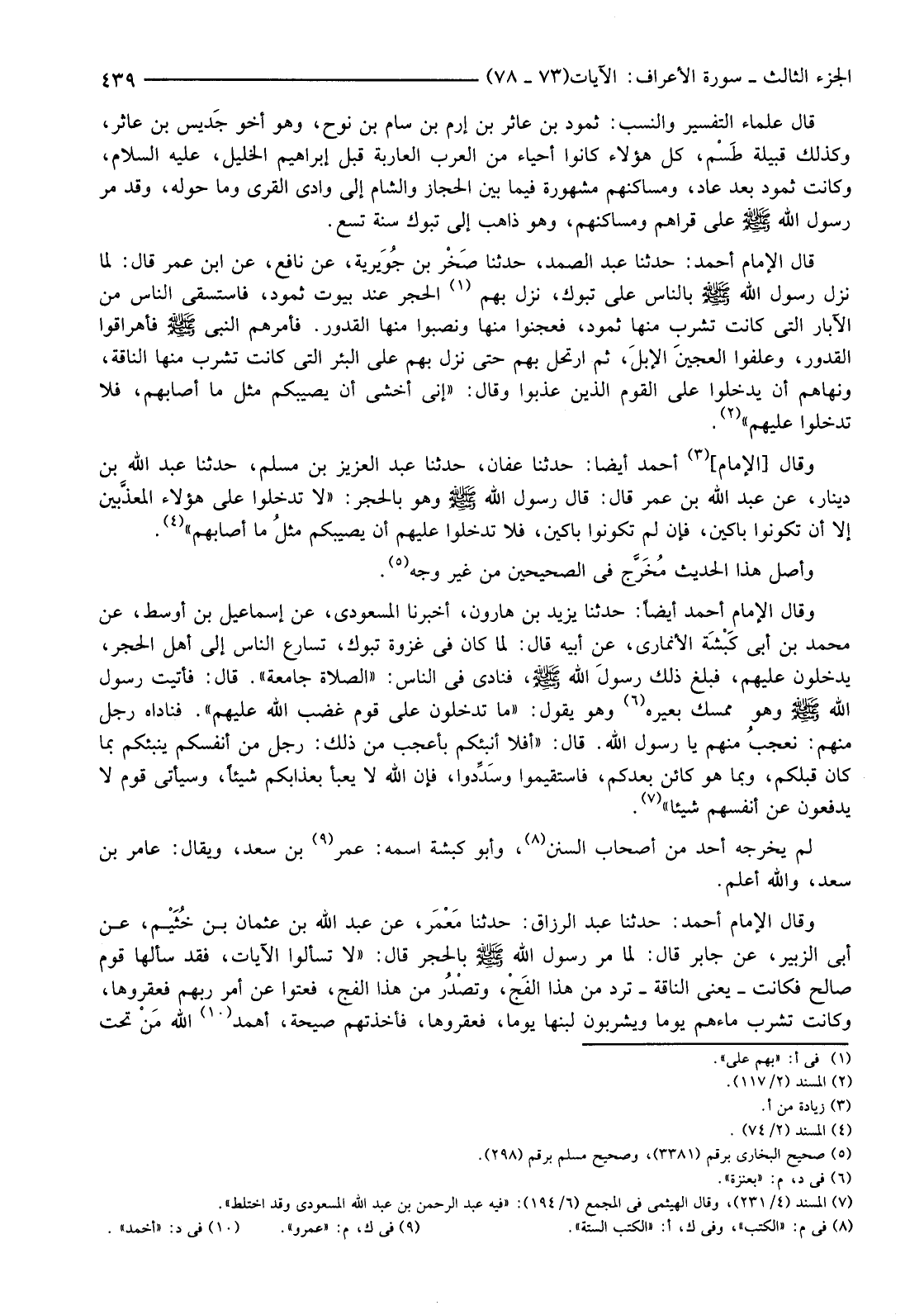 قَالَ الْإِمَامُ أَحْمَدُ: حَدَّثَنَا عَبْدُ الصَّمَدِ، حَدَّثَنَا صَخْر بْنُ جُوَيرية، عَنْ نَافِعٍ، عَنِ ابْنِ عُمَرَ قَالَ: لَمَّا نَزَلَ رَسُولُ اللَّهِ صَلَّى اللَّهُ عَلَيْهِ وَسَلَّمَ بِالنَّاسِ عَلَى تَبُوكَ، نَزَلَ بِهِمُ (1) الْحِجْرَ عِنْدَ بُيُوتِ ثَمُودَ، فَاسْتَسْقَى النَّاسُ مِنَ الْآبَارِ الَّتِي كَانَتْ تَشْرَبُ مِنْهَا ثَمُودُ، فَعَجَنُوا مِنْهَا وَنَصَبُوا مِنْهَا الْقُدُورَ. فَأَمَرَهُمُ النَّبِيُّ صَلَّى اللَّهُ عَلَيْهِ وَسَلَّمَ فَأَهْرَقُوا الْقُدُورَ، وَعَلَفُوا العجينَ الإبلَ، ثُمَّ ارْتَحَلَ بِهِمْ حَتَّى نَزَلَ بِهِمْ عَلَى الْبِئْرِ الَّتِي كَانَتْ تَشْرَبُ مِنْهَا النَّاقَةُ، وَنَهَاهُمْ أَنْ يَدْخُلُوا عَلَى الْقَوْمِ الَّذِينَ عُذِّبُوا وَقَالَ: "إِنِّي أَخْشَى أَنْ يُصِيبَكُمْ مِثْلُ مَا أَصَابَهُمْ، فَلَا تَدْخُلُوا عَلَيْهِمْ" (2)